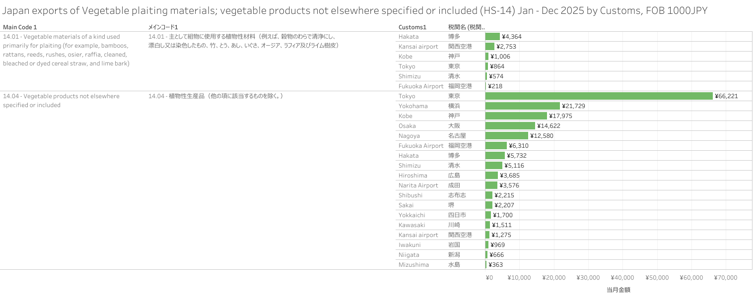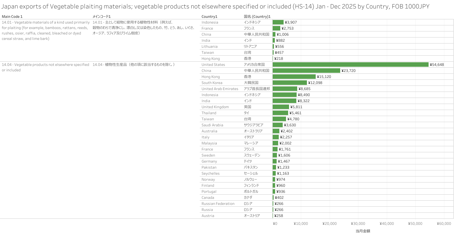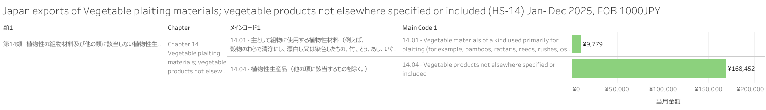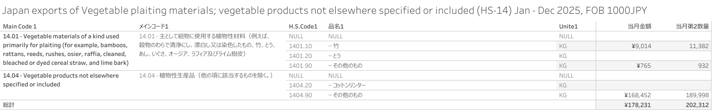日本 植物性の組物材料及び他の類に該当しない植物性生産品(HS-14) 輸出統計 2025年12月まで