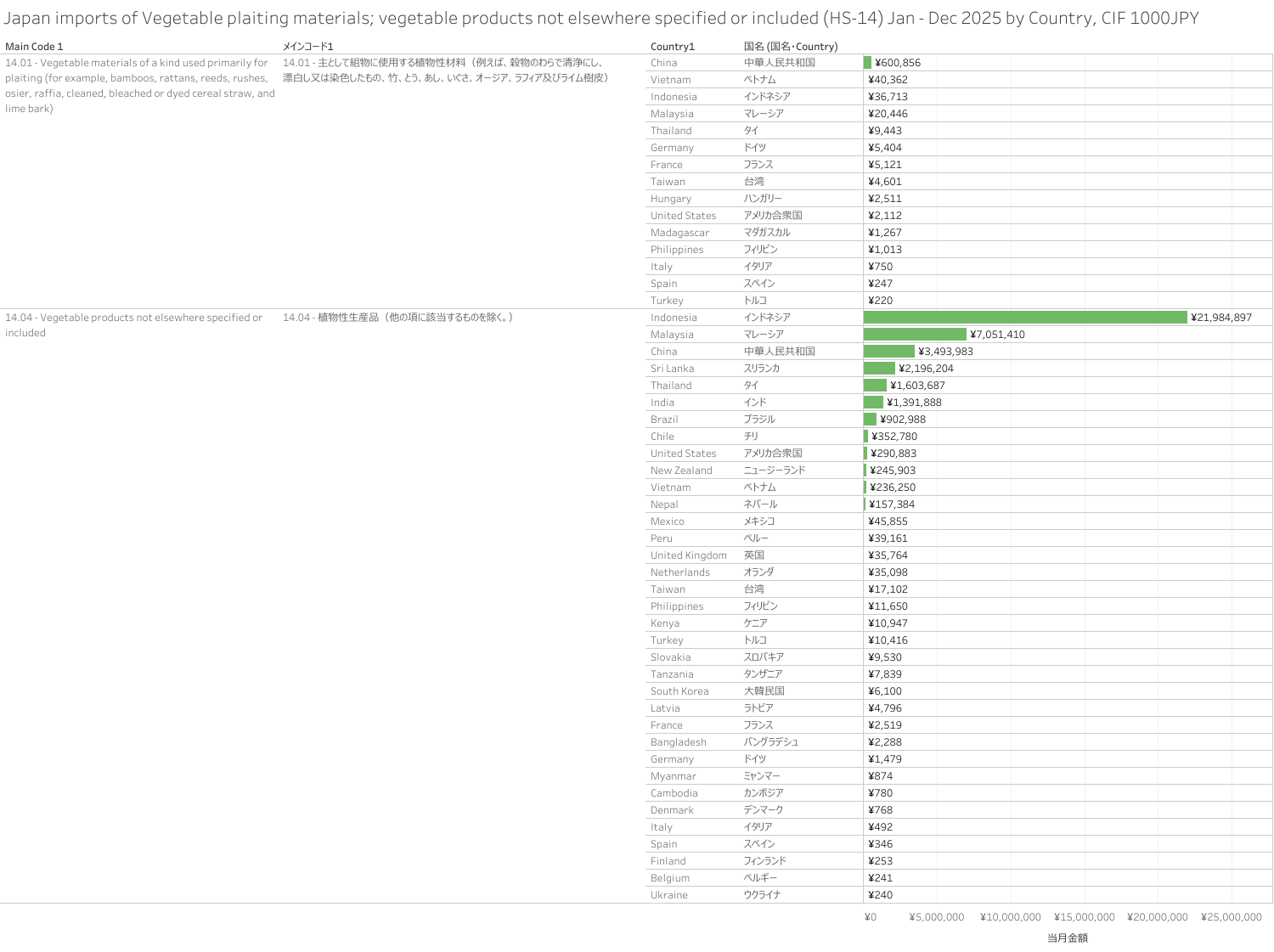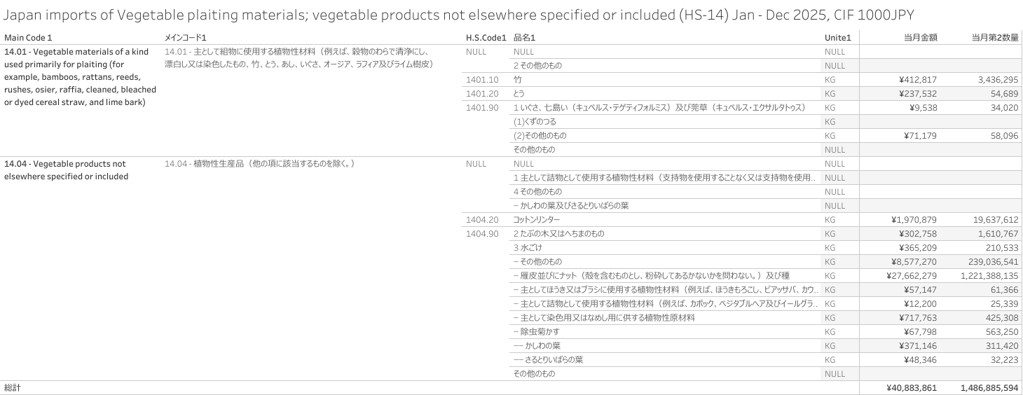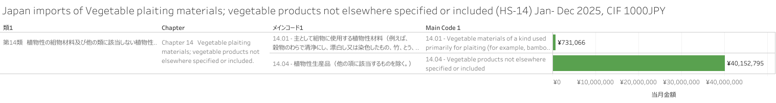 日本 植物性の組物材料及び他の類に該当しない植物性生産品(HS-14) 輸入統計 2025年12月まで
