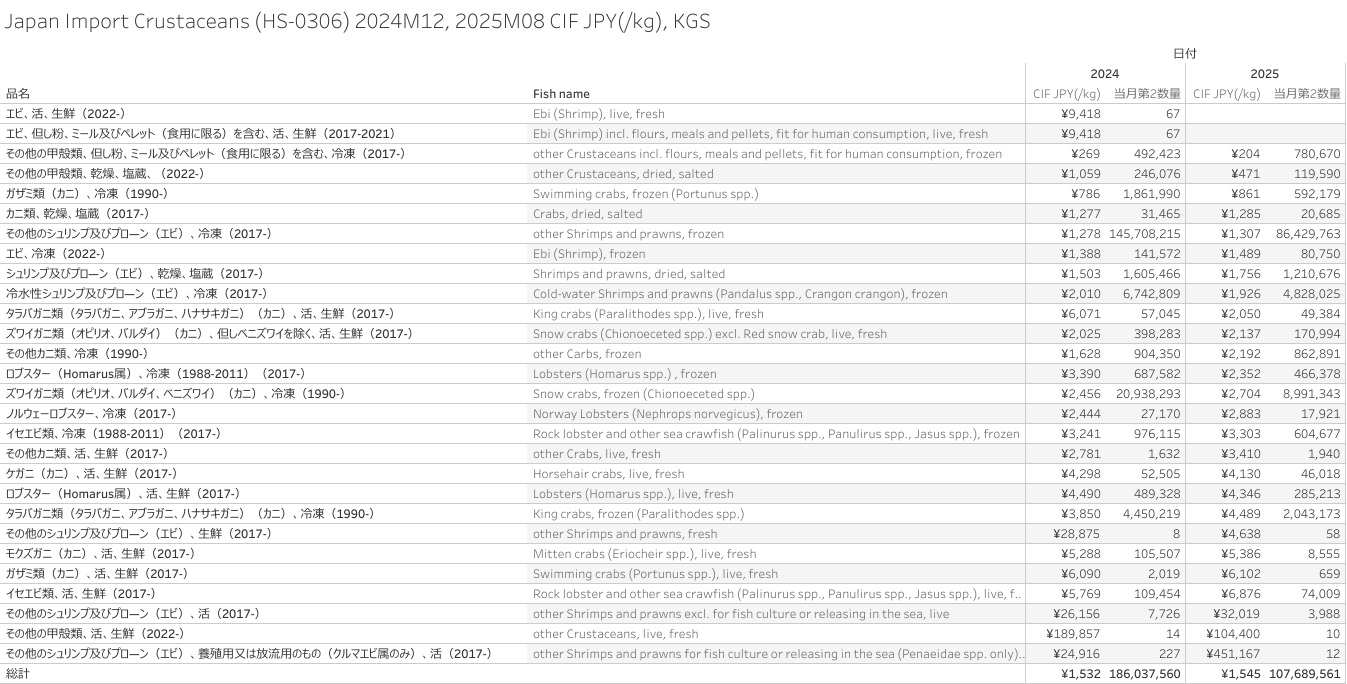 日本 水産物(HS-0305, 0306)輸入統計 2024年12月&2025年8月まで