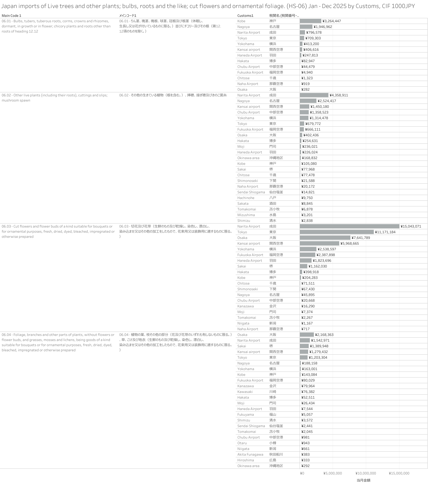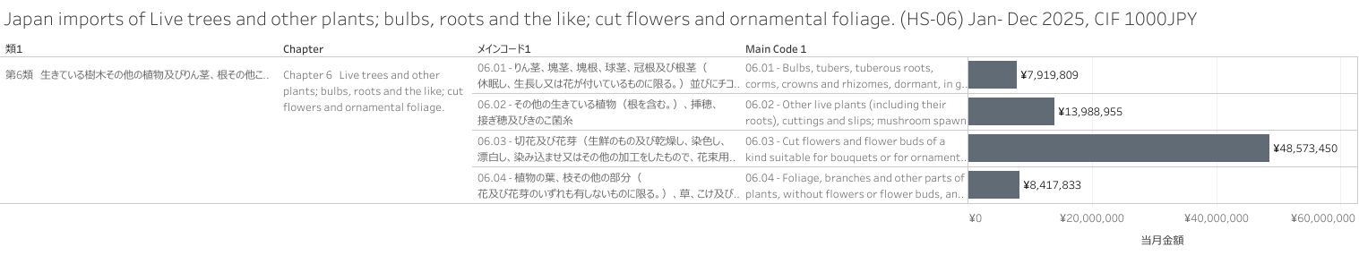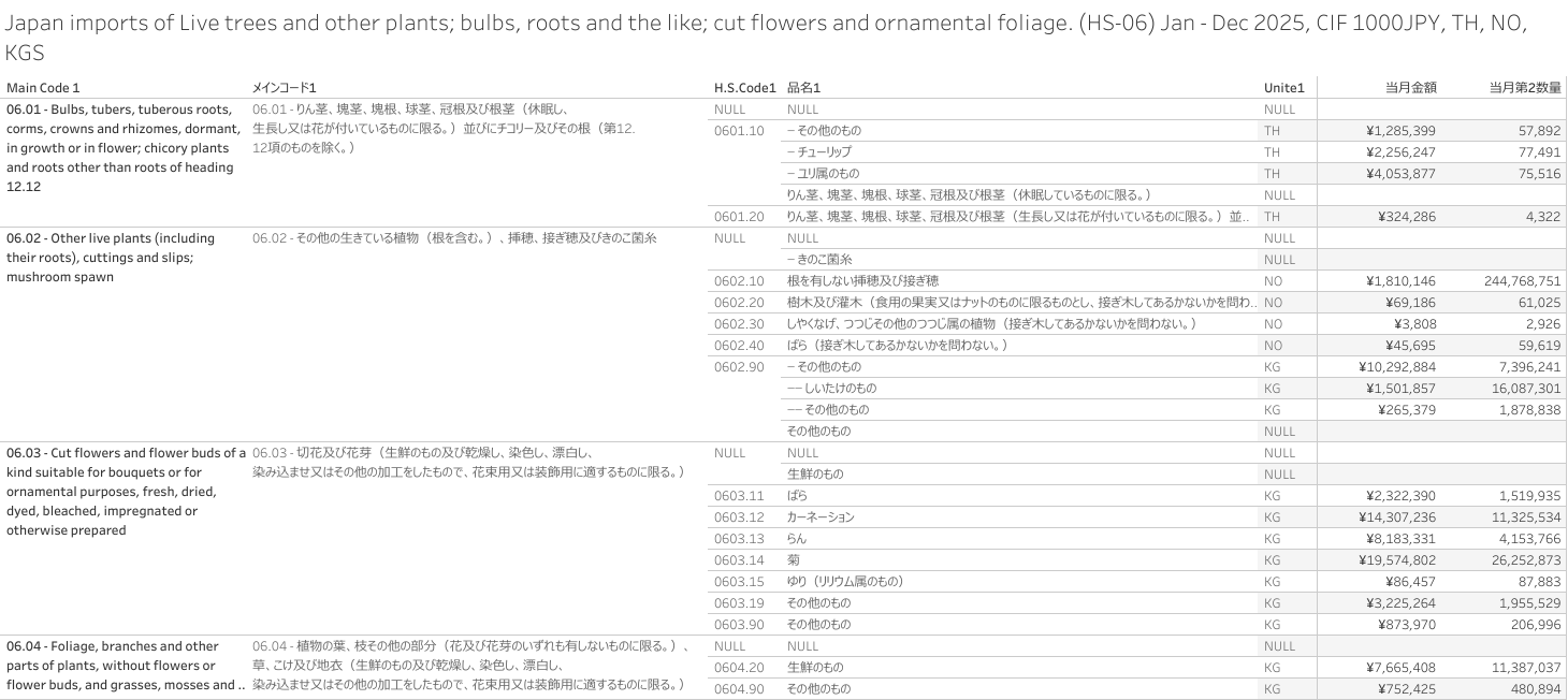 日本 生きている樹木その他の植物及びりん茎、根その他これらに類する物品並びに切花及び装飾用の葉(HS-06) 輸入統計 2025年12月まで Japan Imports of Live trees and other plants; bulbs, roots and the like; cut flowers and ornamental foliage. (HS-06) Jan - Dec 2025