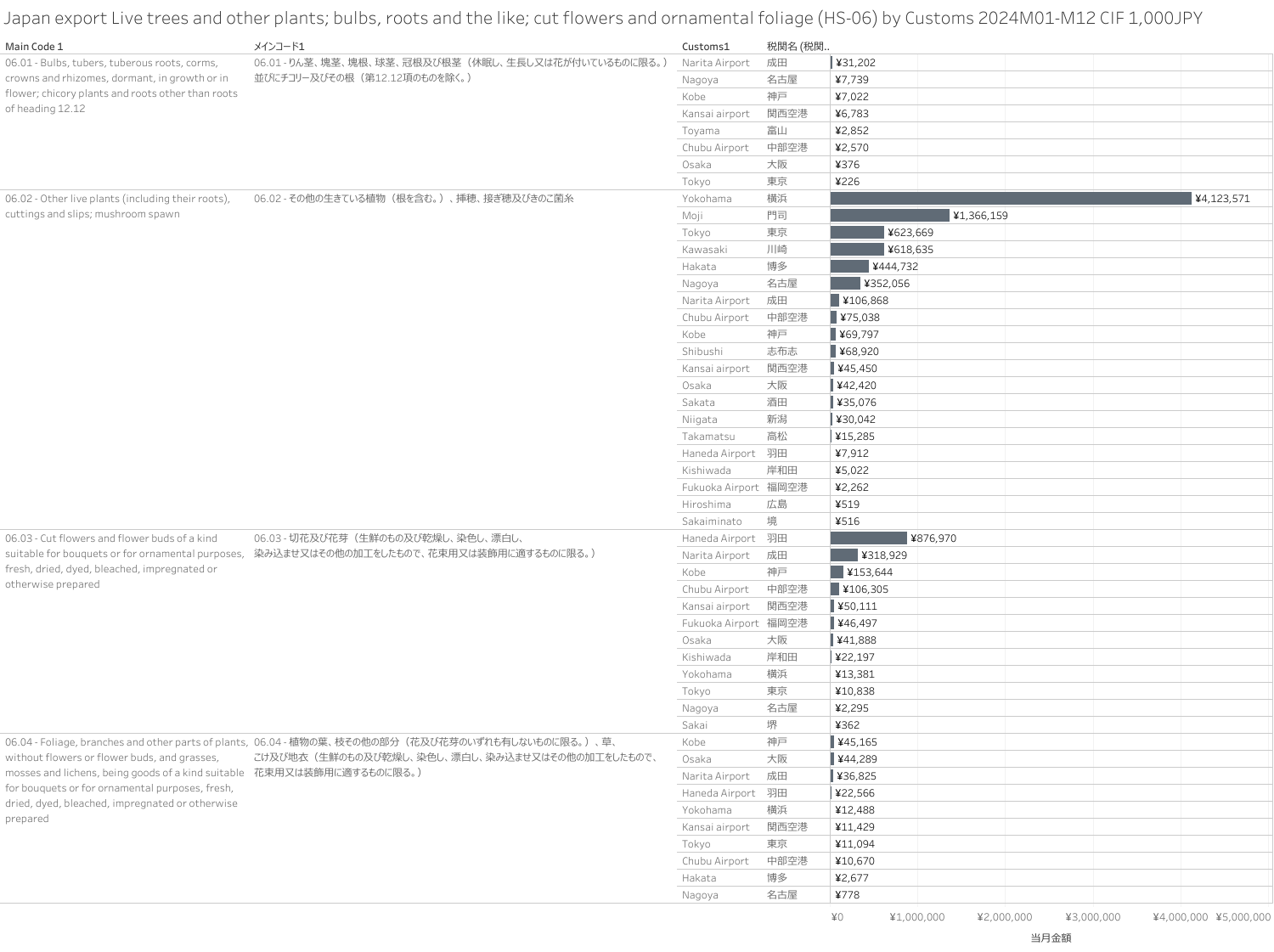 Japan export Live trees and other plants; bulbs, roots and the like; cut flowers and ornamental foliage. (HS-06) 2024M01-M012