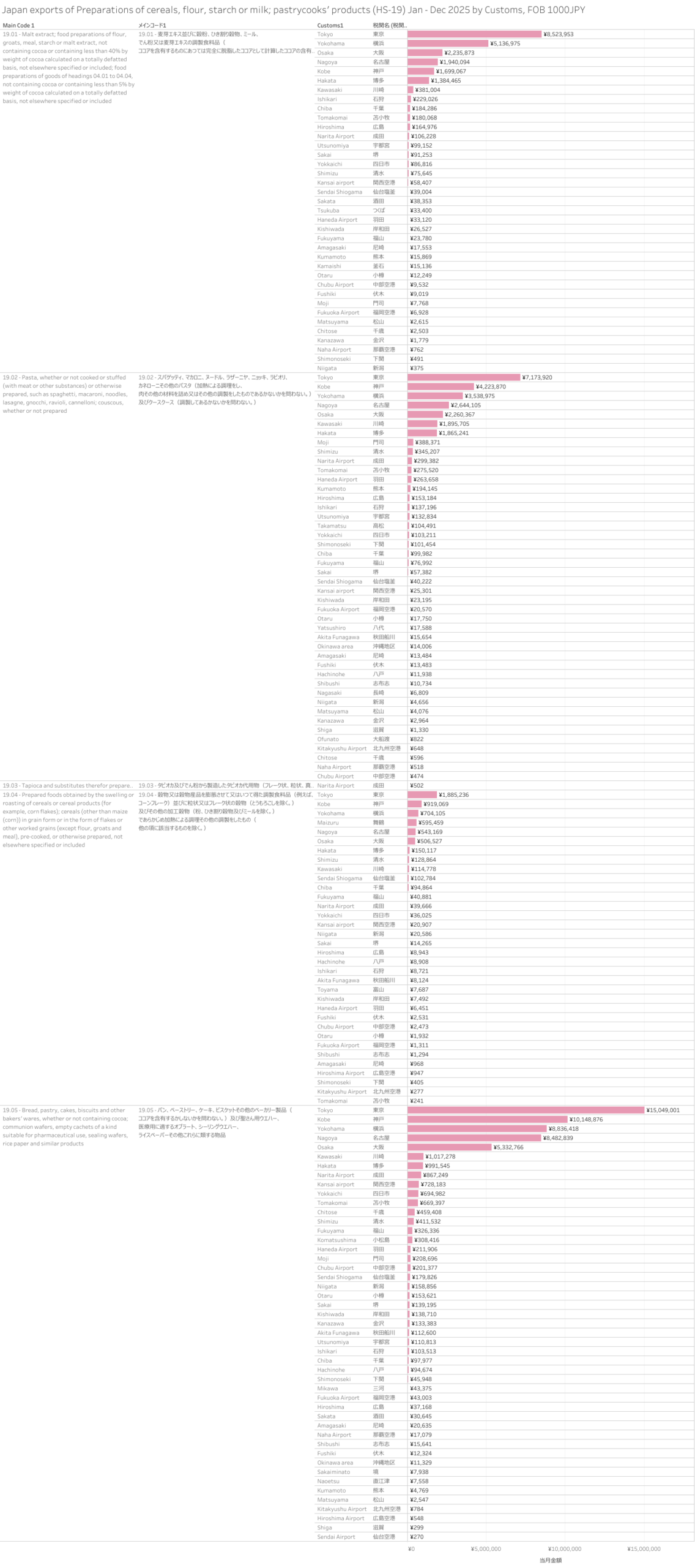 日本 穀物、穀粉、でん粉又はミルクの調製品及びベーカリー製品(HS-19)輸出統計 2025年12月まで