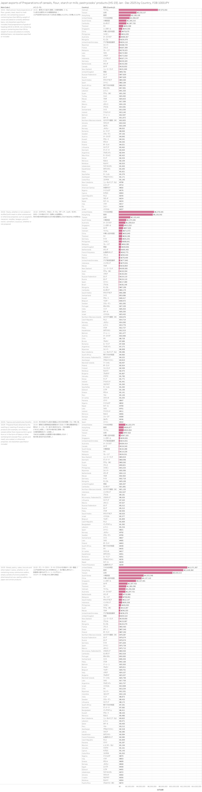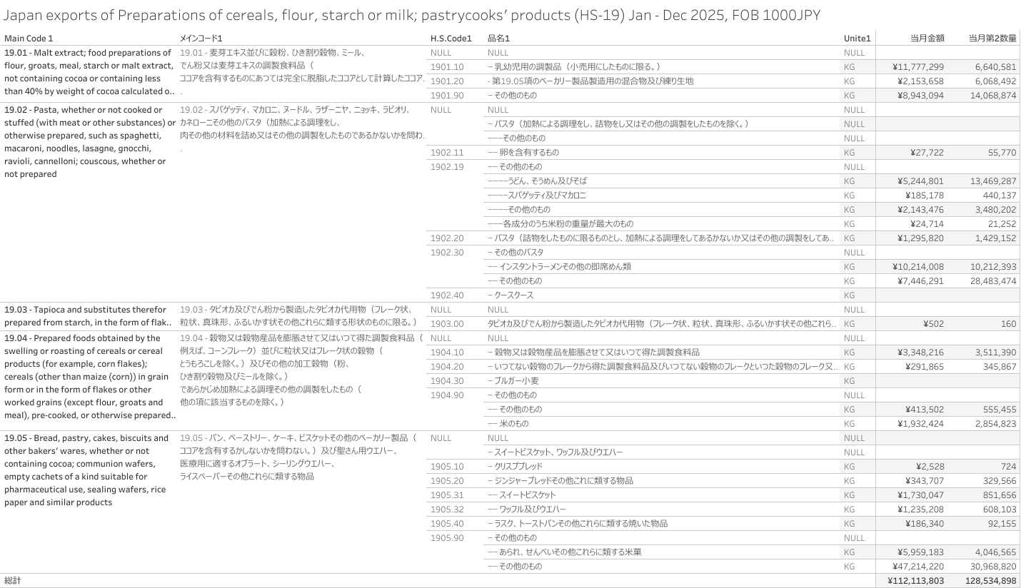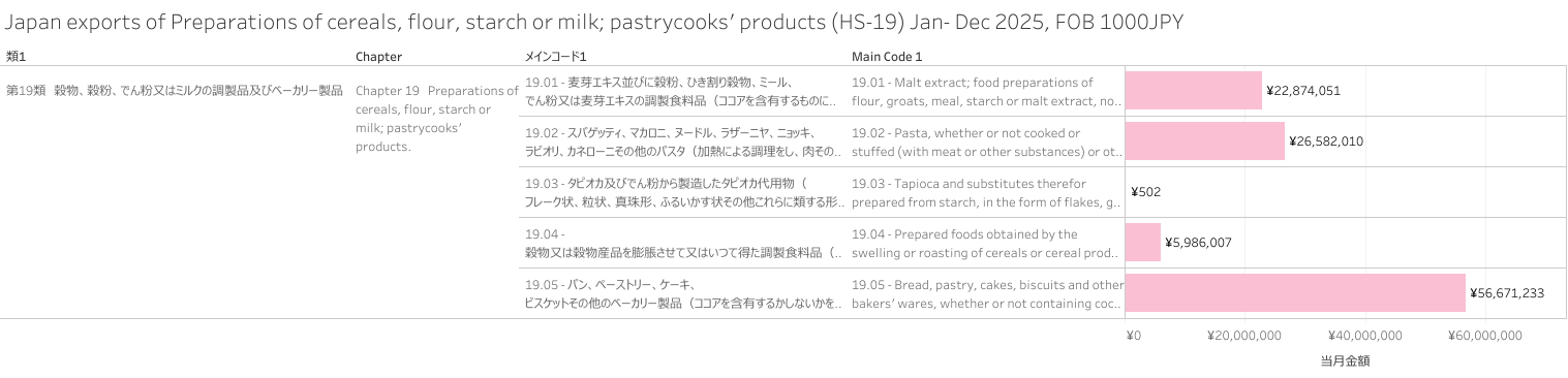 日本 穀物、穀粉、でん粉又はミルクの調製品及びベーカリー製品(HS-19)輸出統計 2025年12月まで