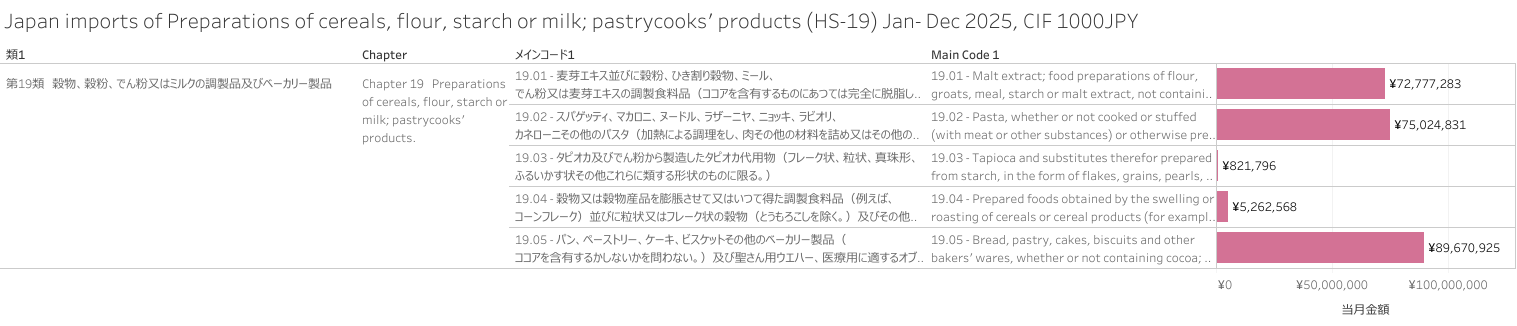 日本 穀物、穀粉、でん粉又はミルクの調製品及びベーカリー製品(HS-19)輸入統計 2025年12月まで