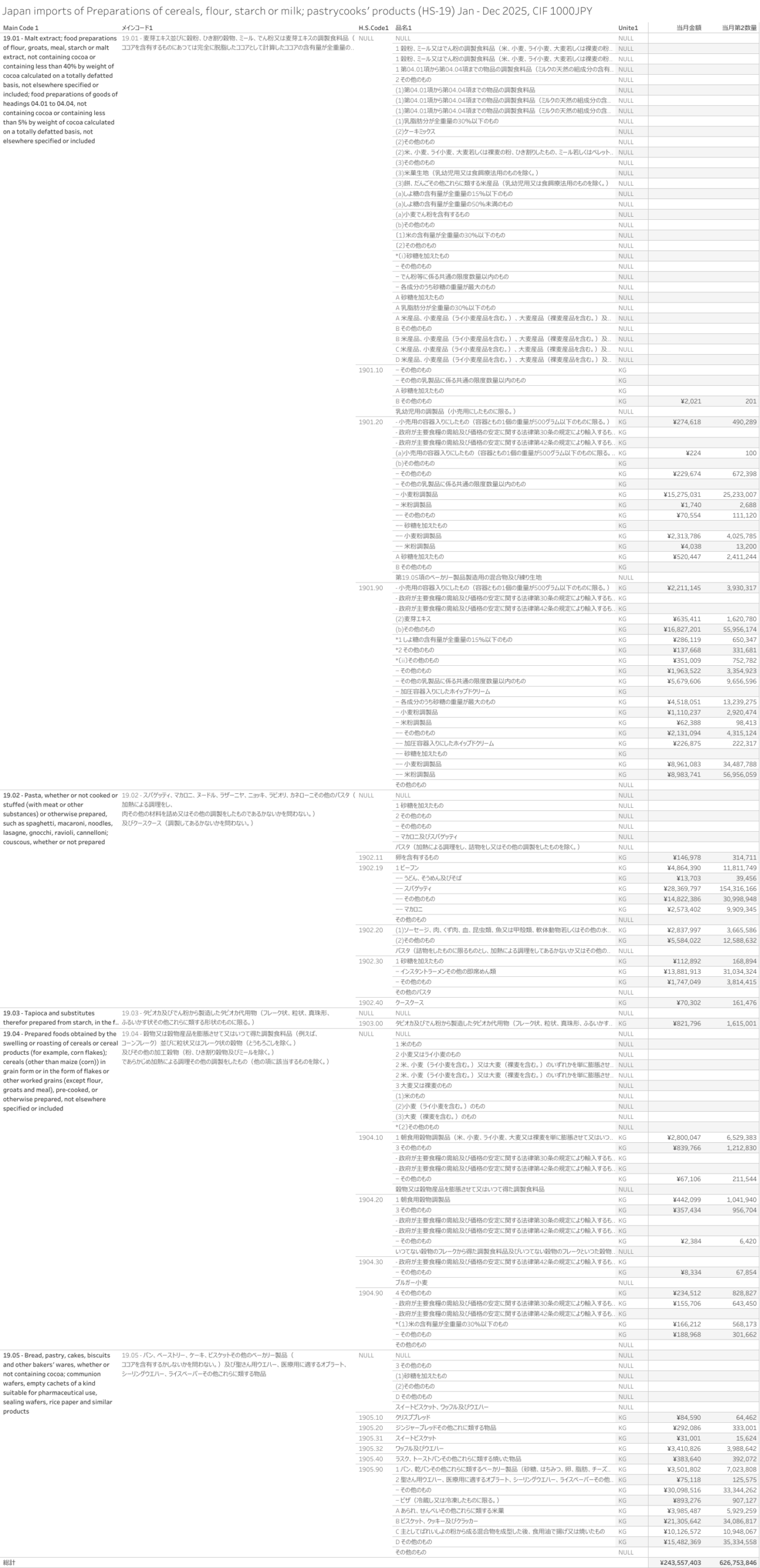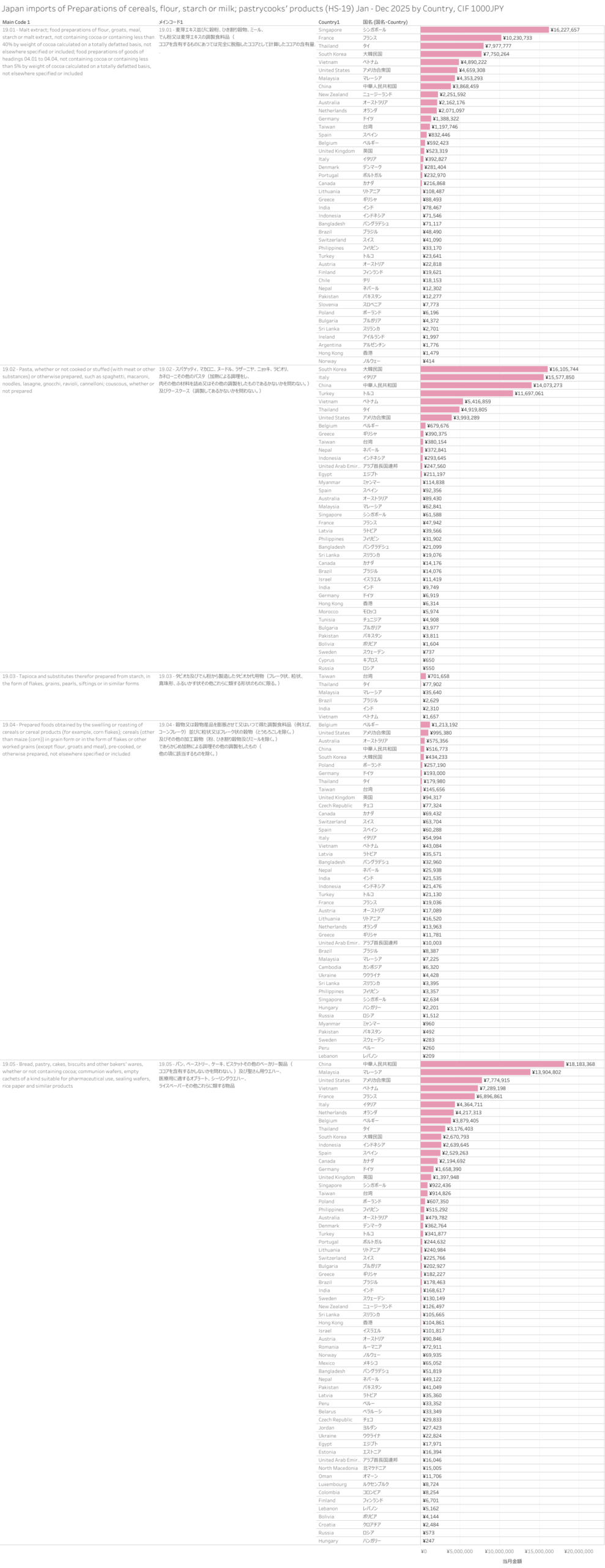 Japan Imports of Preparations of cereals, flour, starch or milk; pastrycooks' products. (HS-19) Jan-Dec 2025