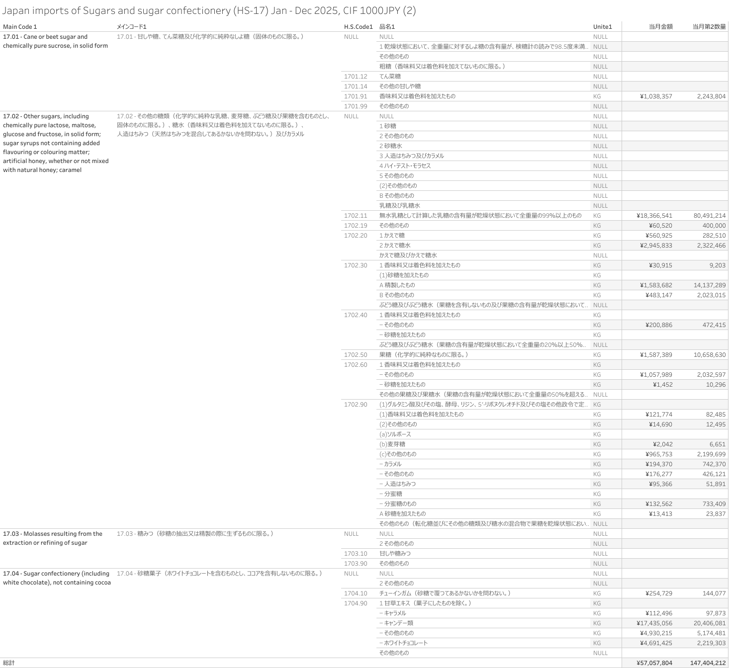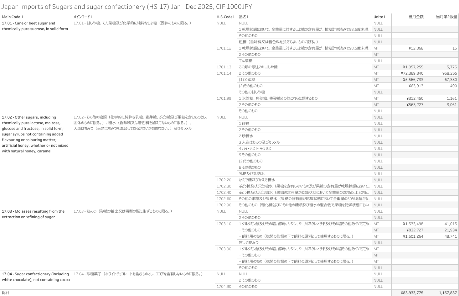 日本 糖類及び砂糖菓子(HS-17)輸入統計 2025年12月まで