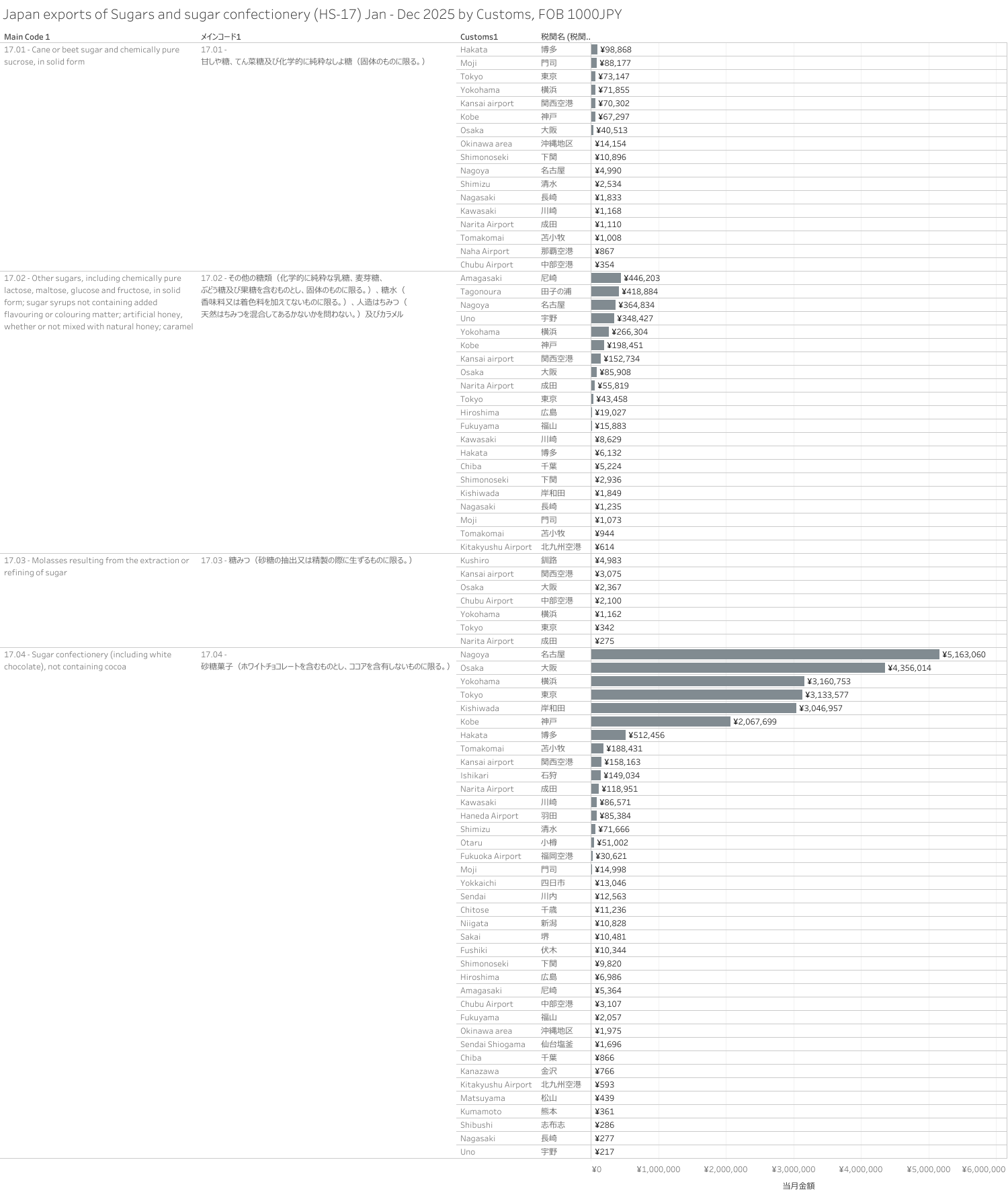 Japan Exports of Sugars and sugar confectionery. (HS-17) Jan-Dec 2025