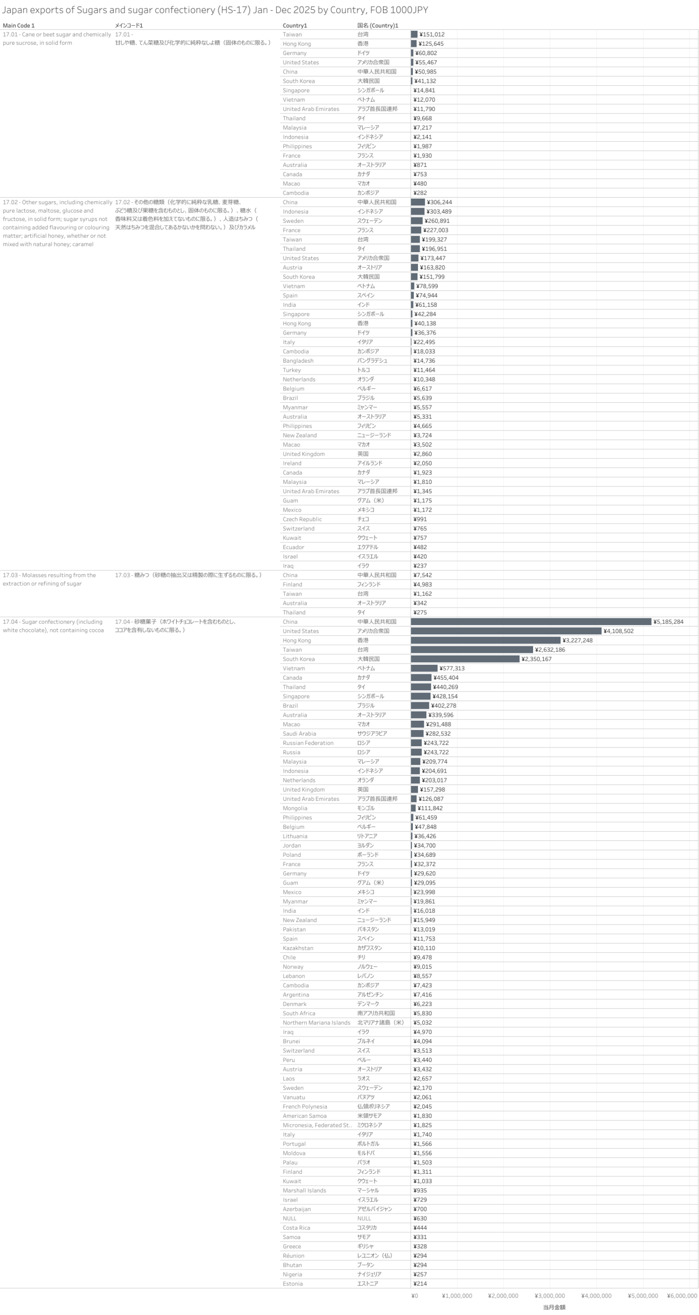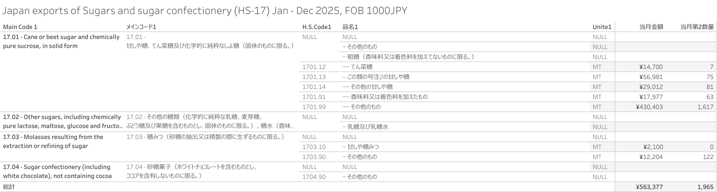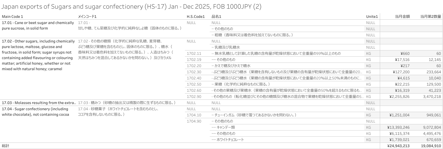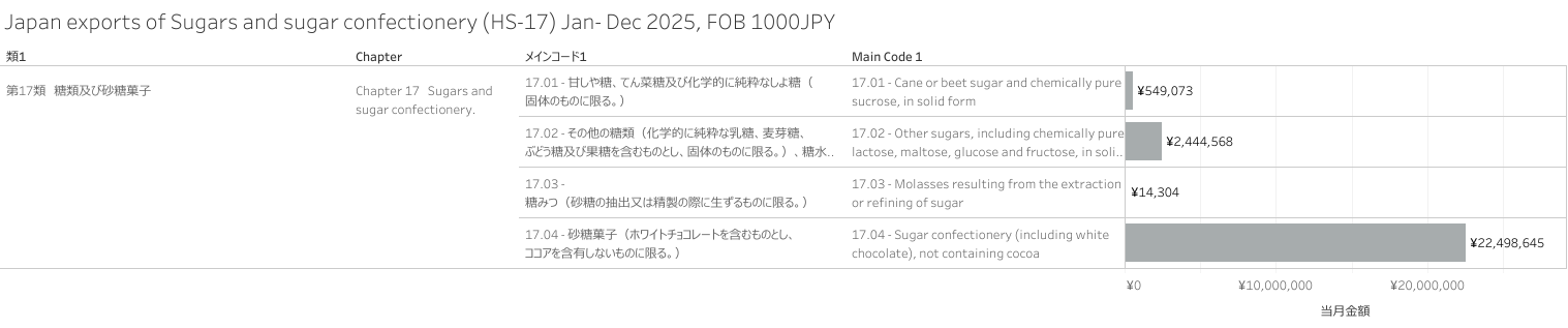 日本 糖類及び砂糖菓子(HS-17)輸出統計 2025年12月まで