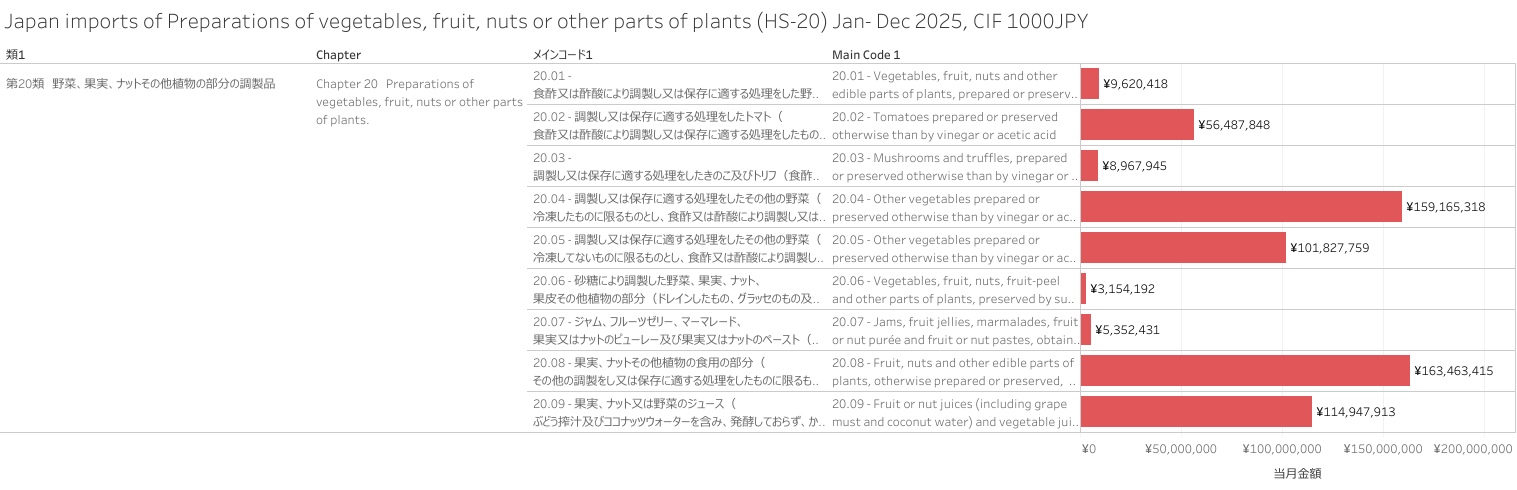 日本 野菜、果実、ナットその他植物の部分の調製品(HS-20)輸入統計 2025年12月まで