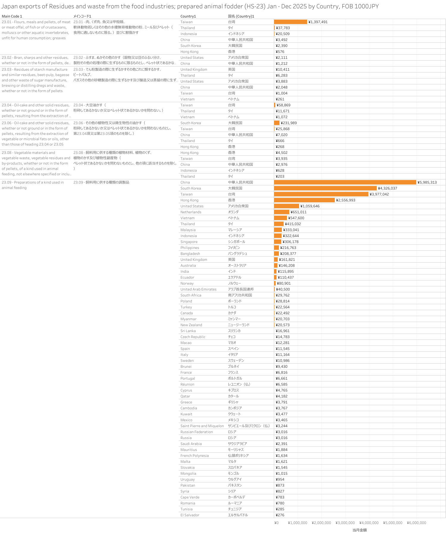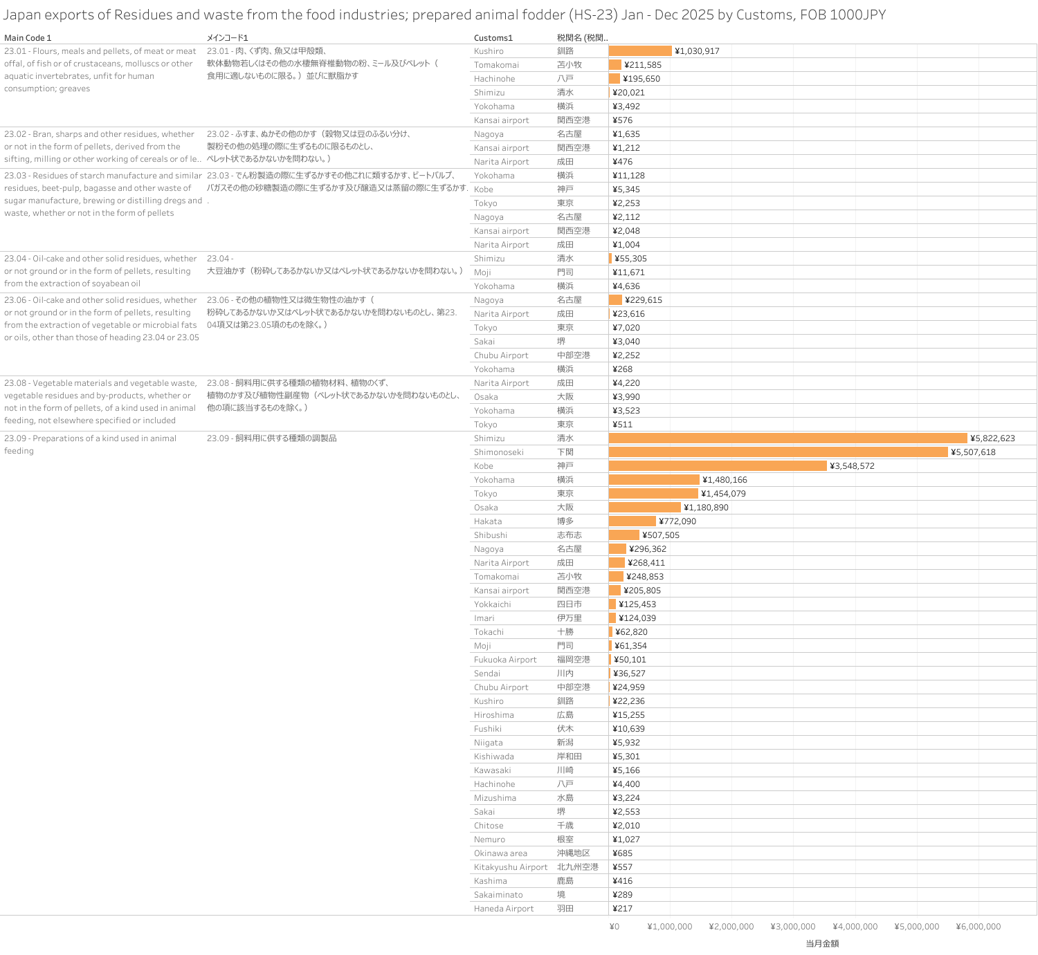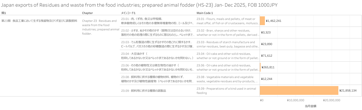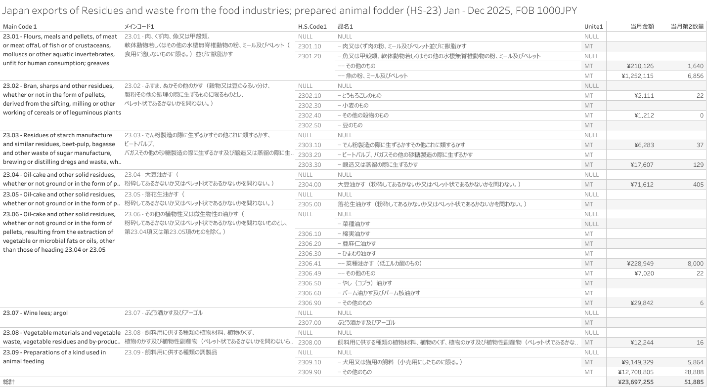 日本 食品工業において生ずる残留物及びくず並びに調製飼料(HS-23)輸出統計 2025年12月まで