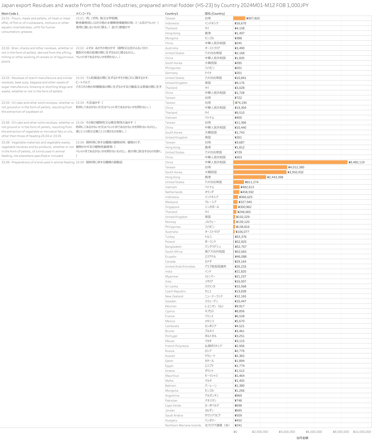 日本 食品工業において生ずる残留物及びくず並びに調製飼料(HS-23)輸出統計 2024年12月まで