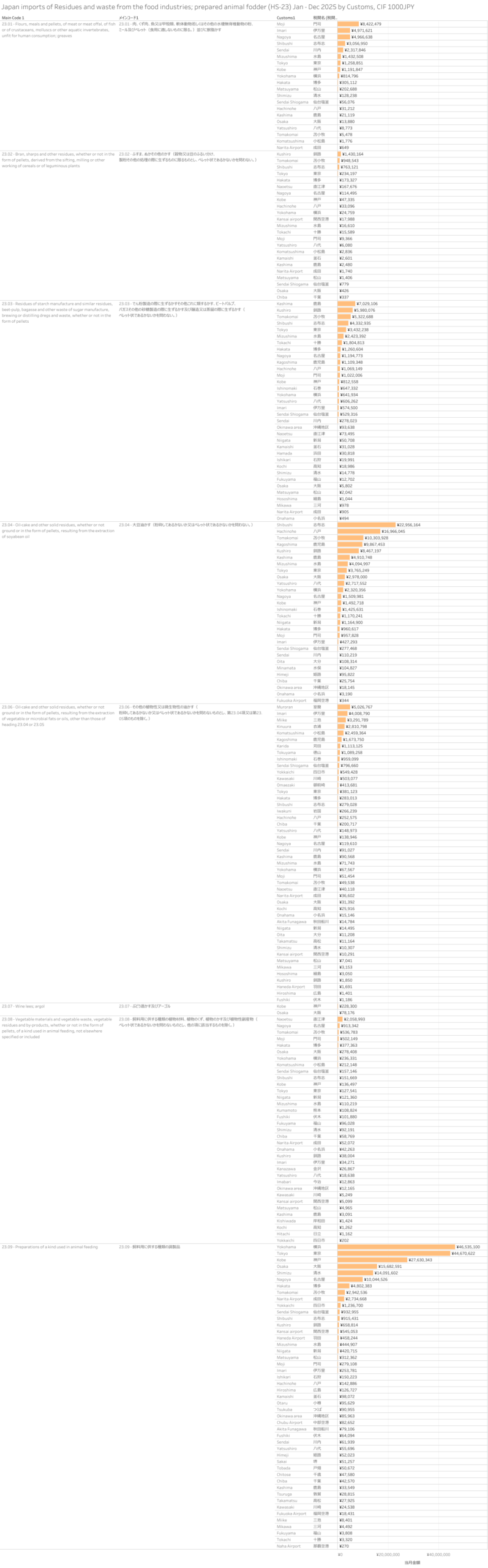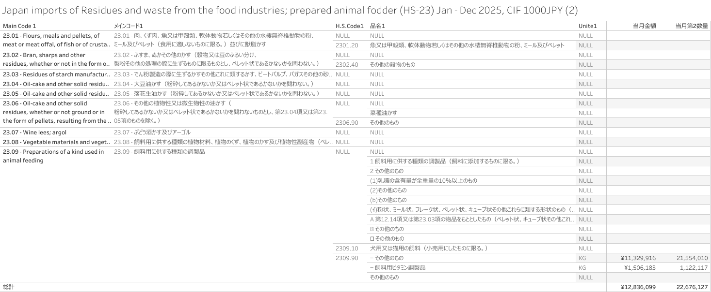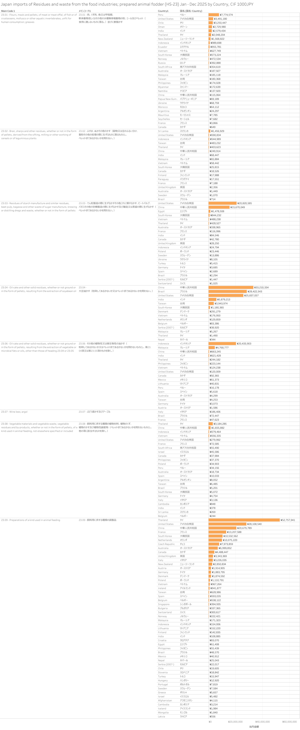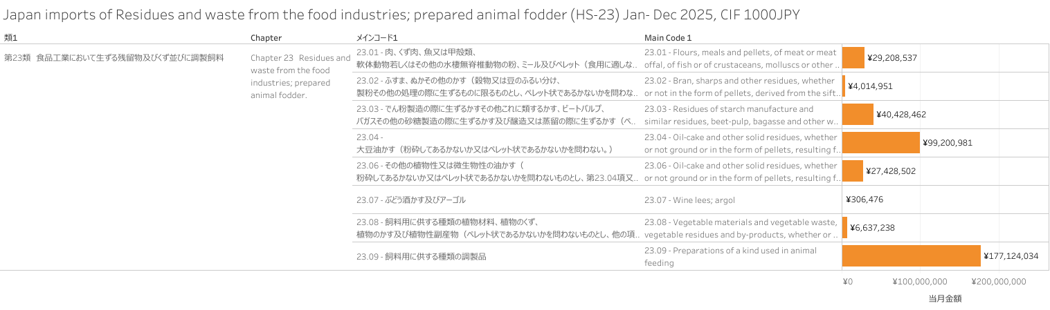 日本 食品工業において生ずる残留物及びくず並びに調製飼料(HS-23)輸入統計 2025年12月まで