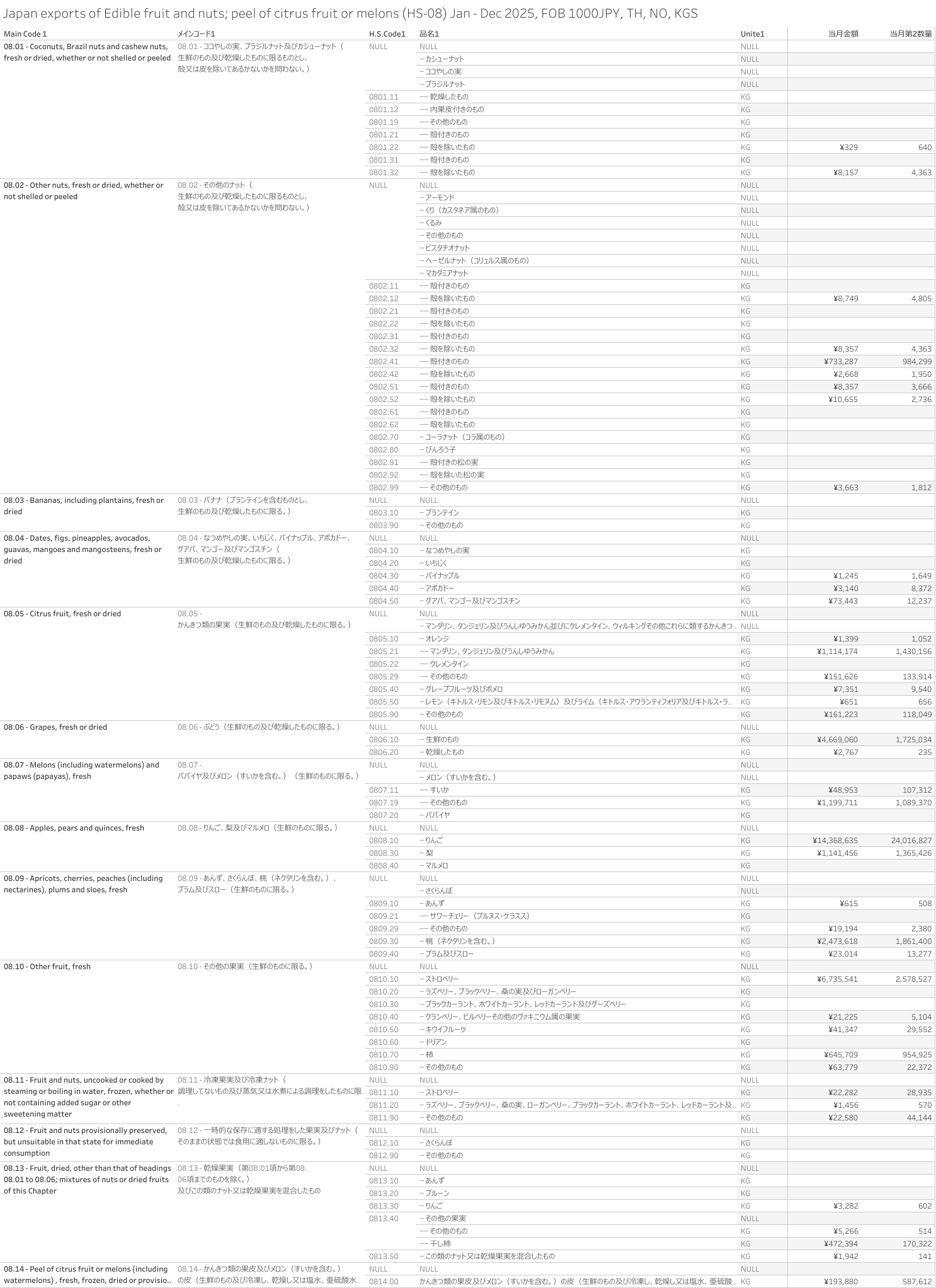 Japan Exports of Edible fruit and nuts; peel of citrus fruit or melons. (HS-08) Jan - Dec 2025