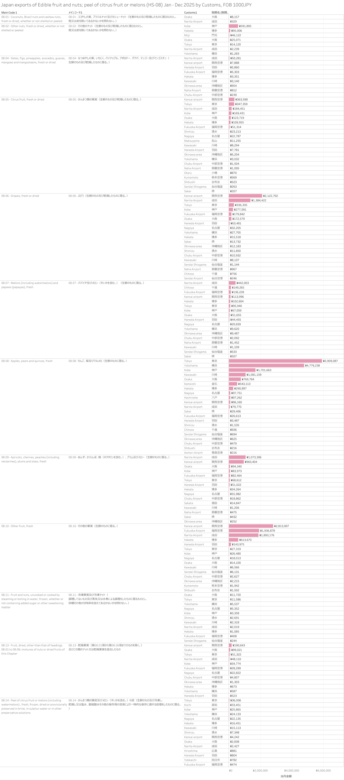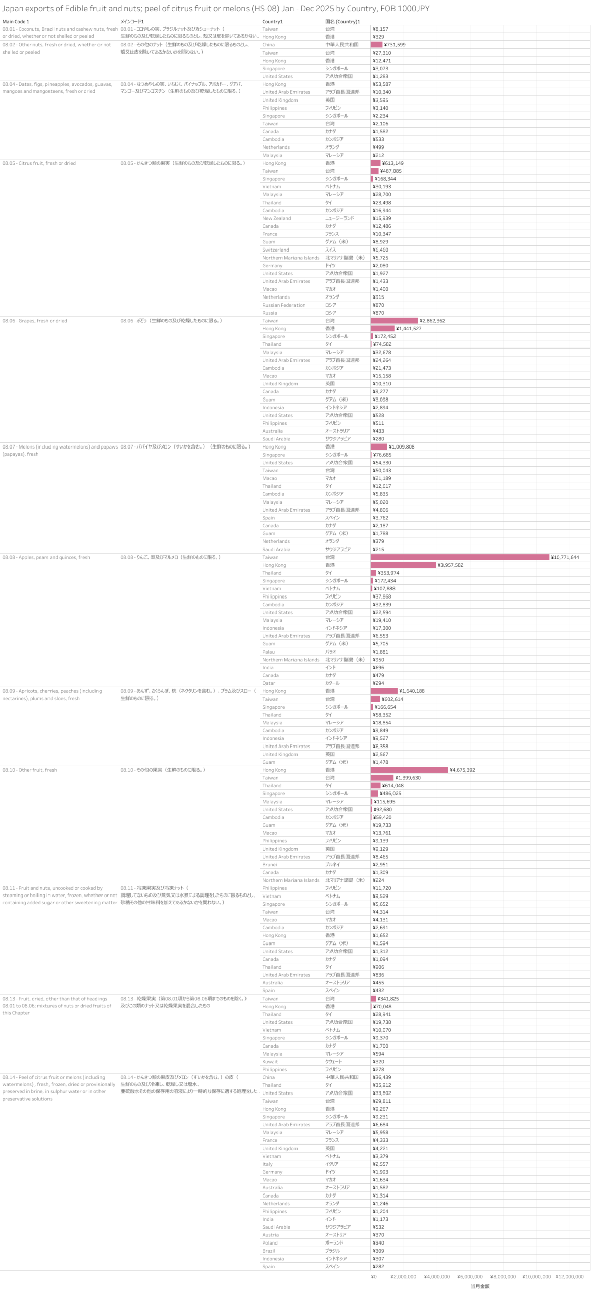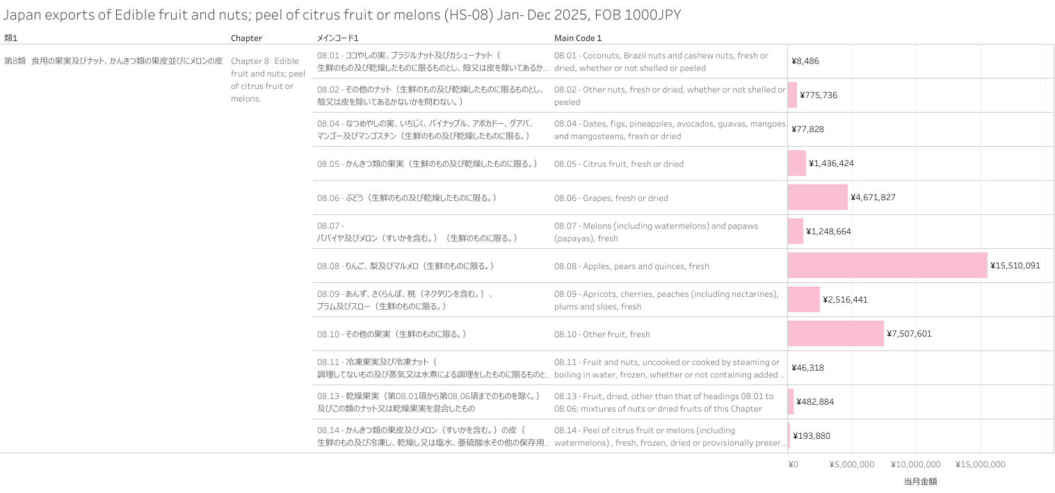 日本 食用の果実及びナット、かんきつ類の果皮並びにメロンの皮(HS-08) 輸出統計 2025年12月まで