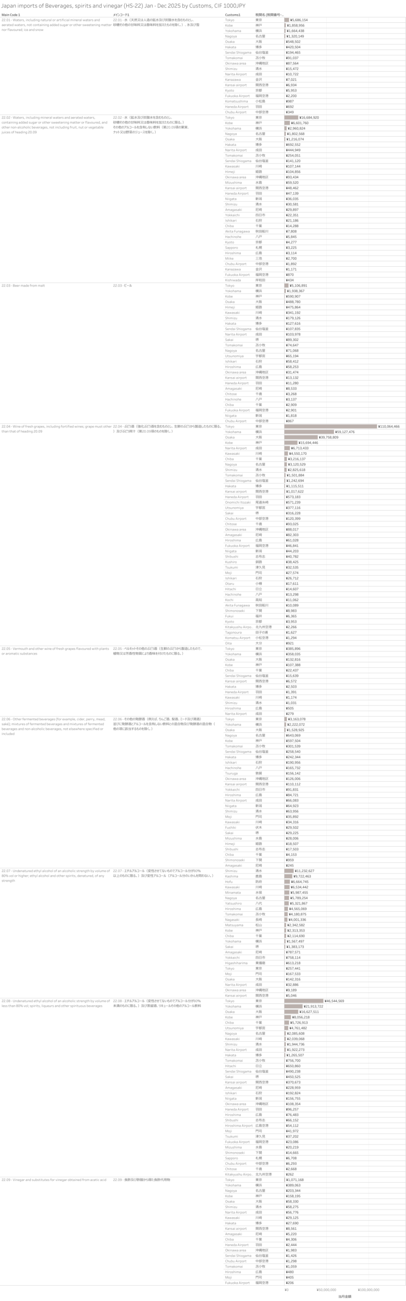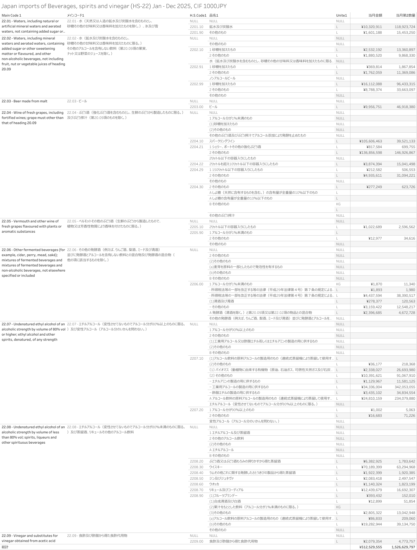 日本 飲料、アルコール及び食酢(HS-22)輸入統計 2025年12月まで
