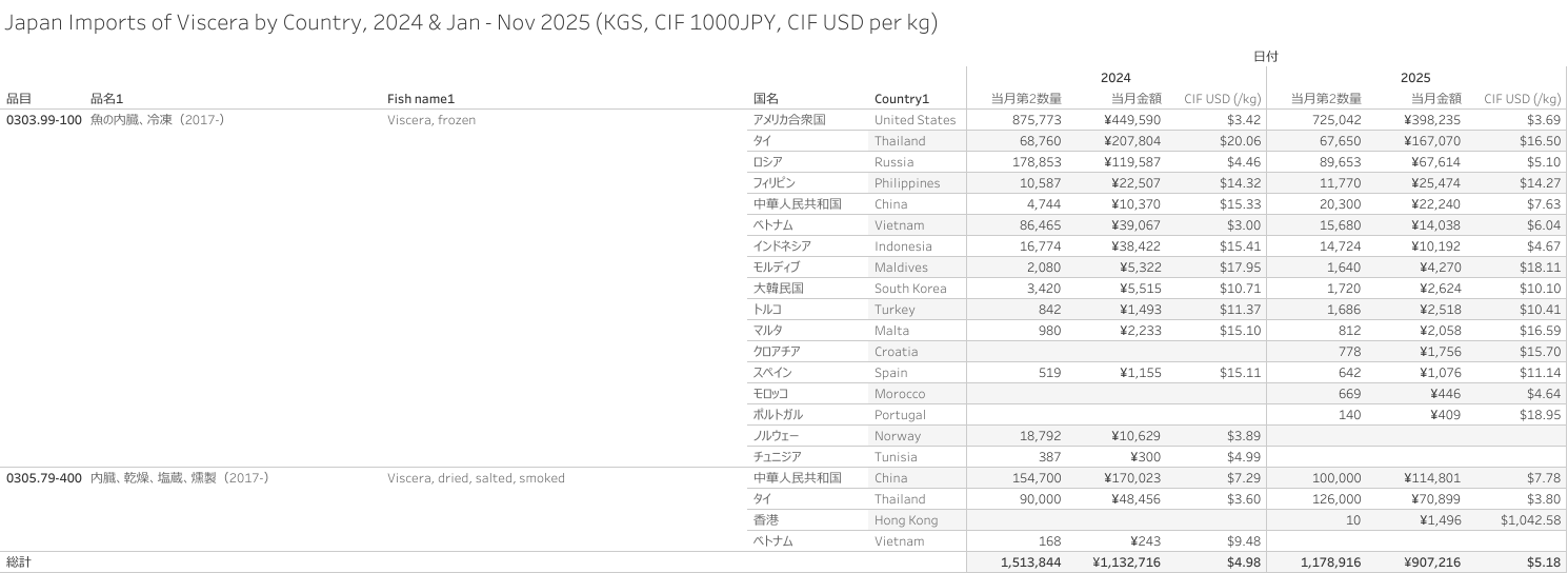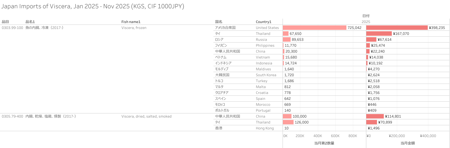 日本 魚の内臓(HS-03)輸入統計 2025年01月-11月