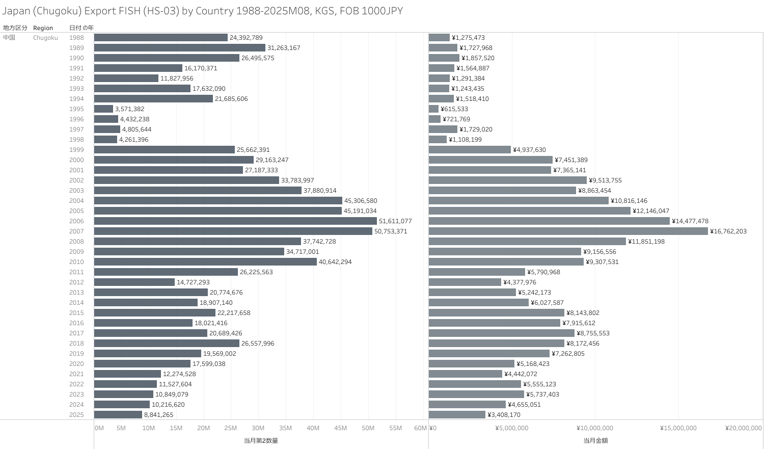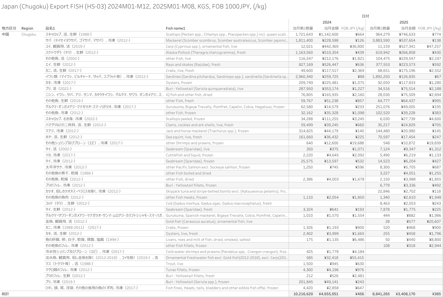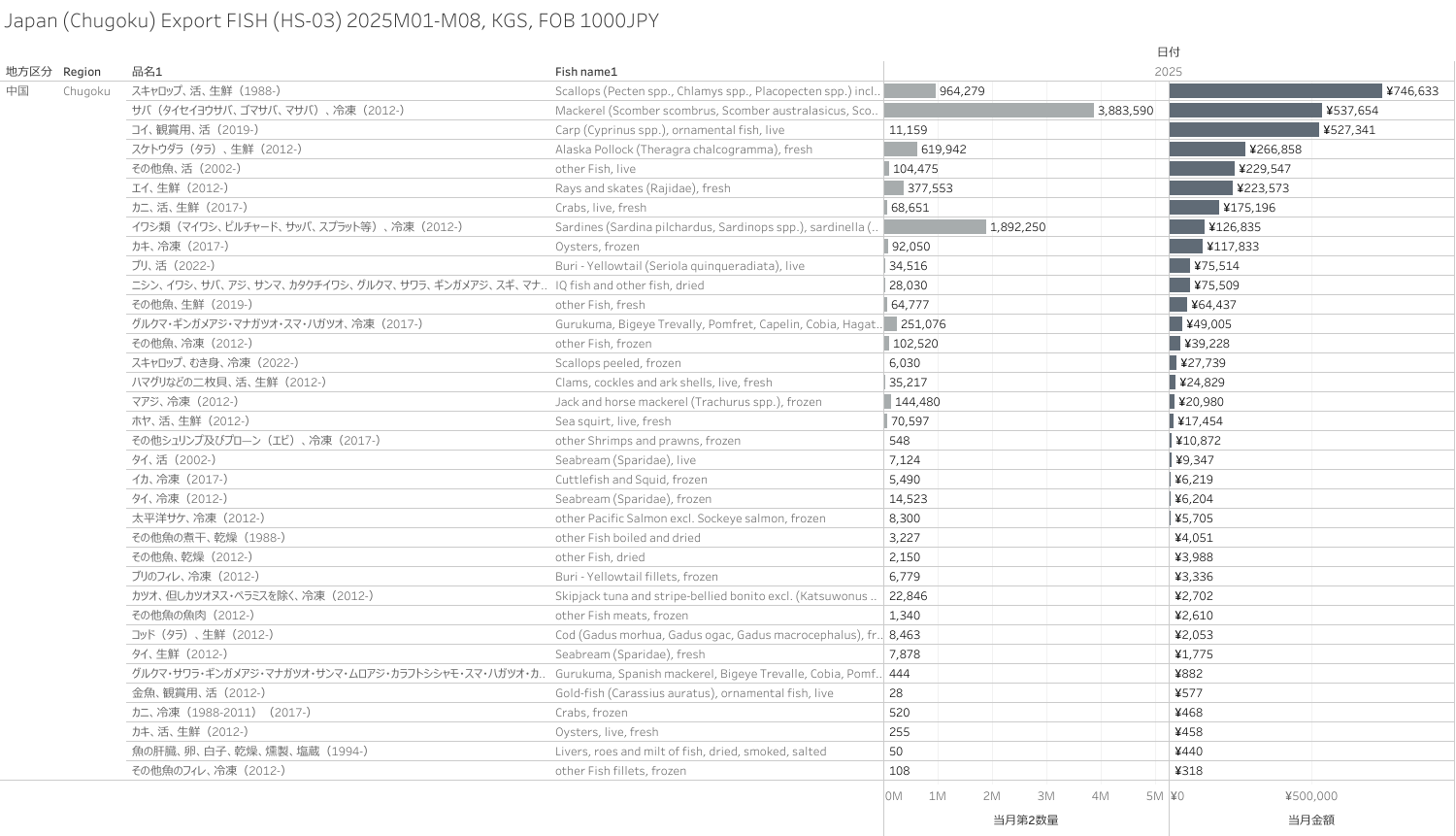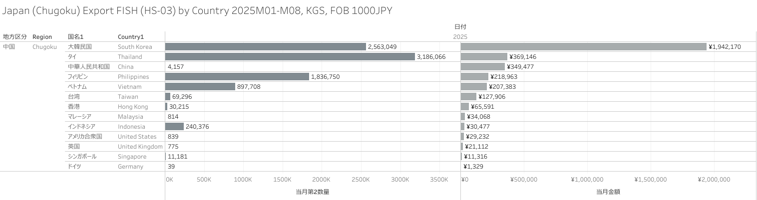 日本(中国地方)水産物(HS-03)輸出統計 2025年8月まで