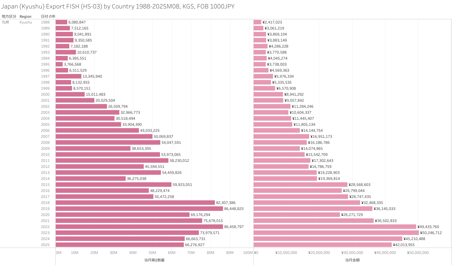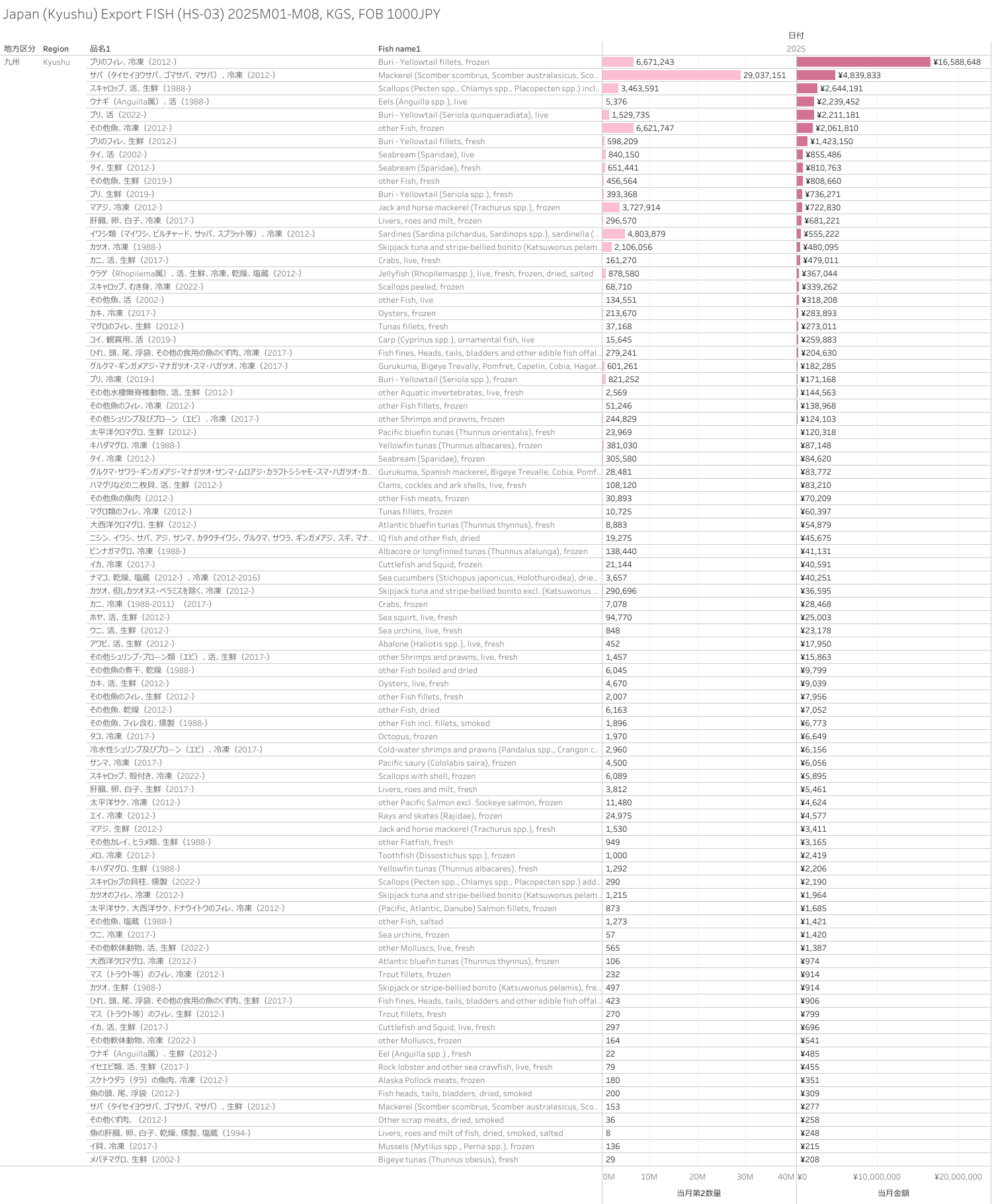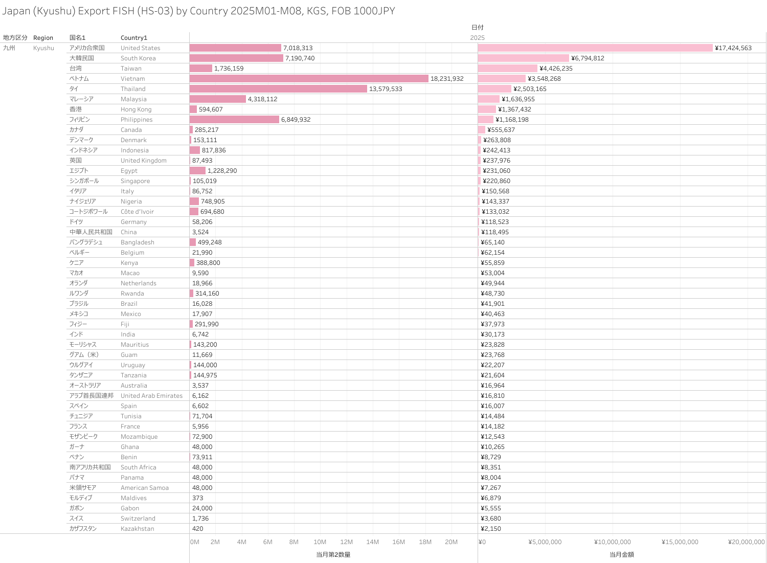 日本(九州地方)水産物(HS-03)輸出統計 2025年8月まで