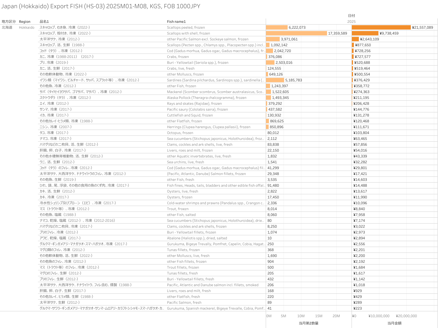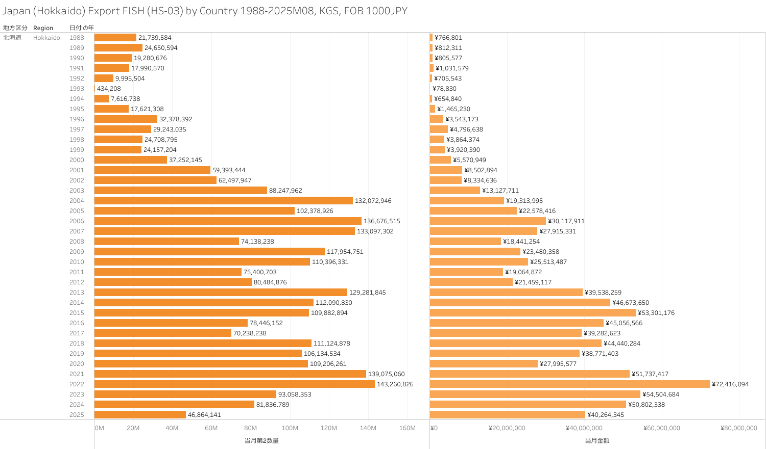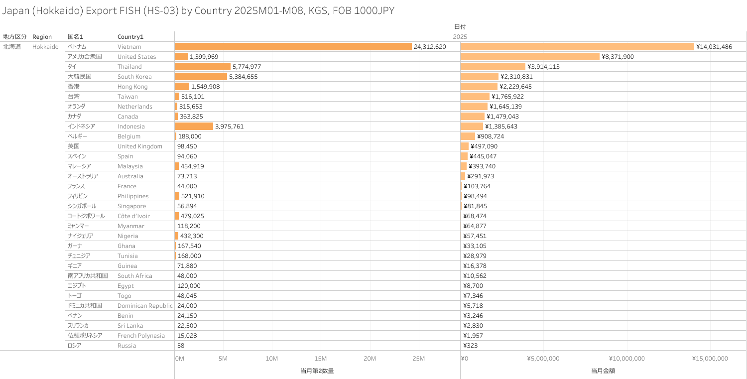 日本(北海道地方)水産物(HS-03)輸出統計 2025年8月まで