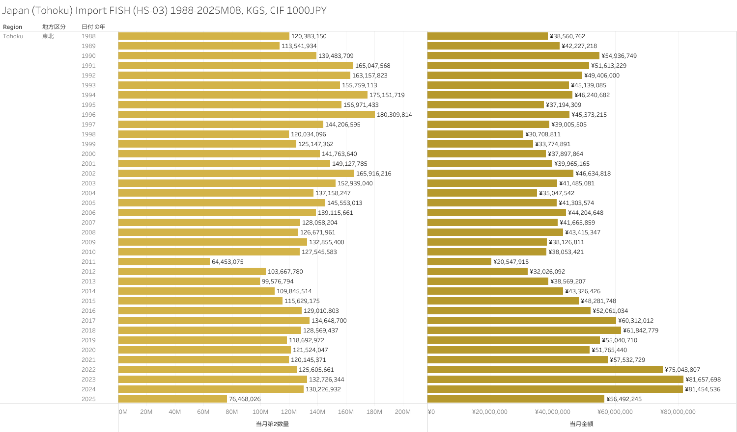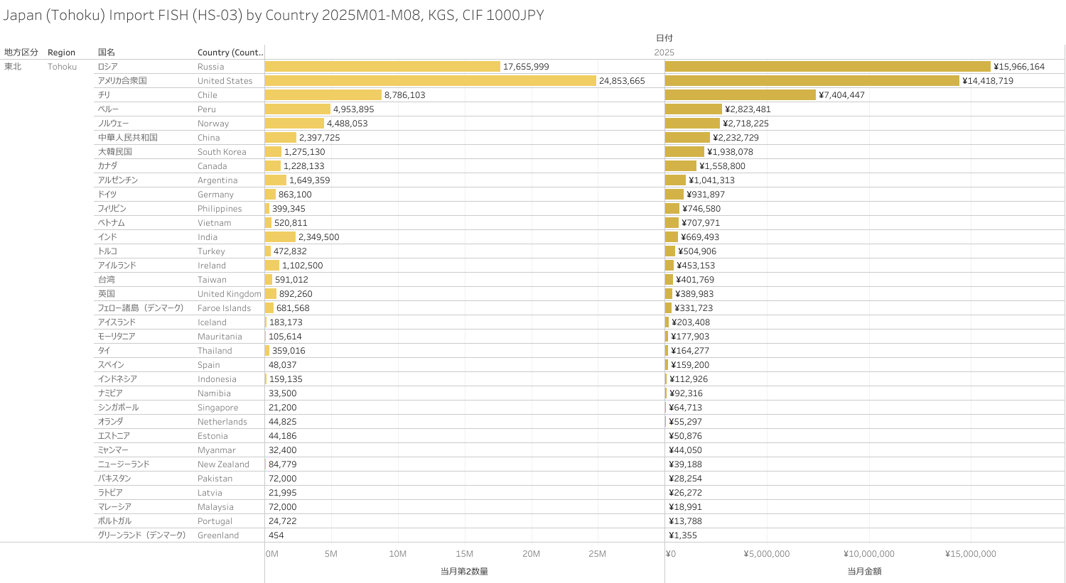 日本(東北地方)水産物(HS-03)輸入統計 2025年8月まで