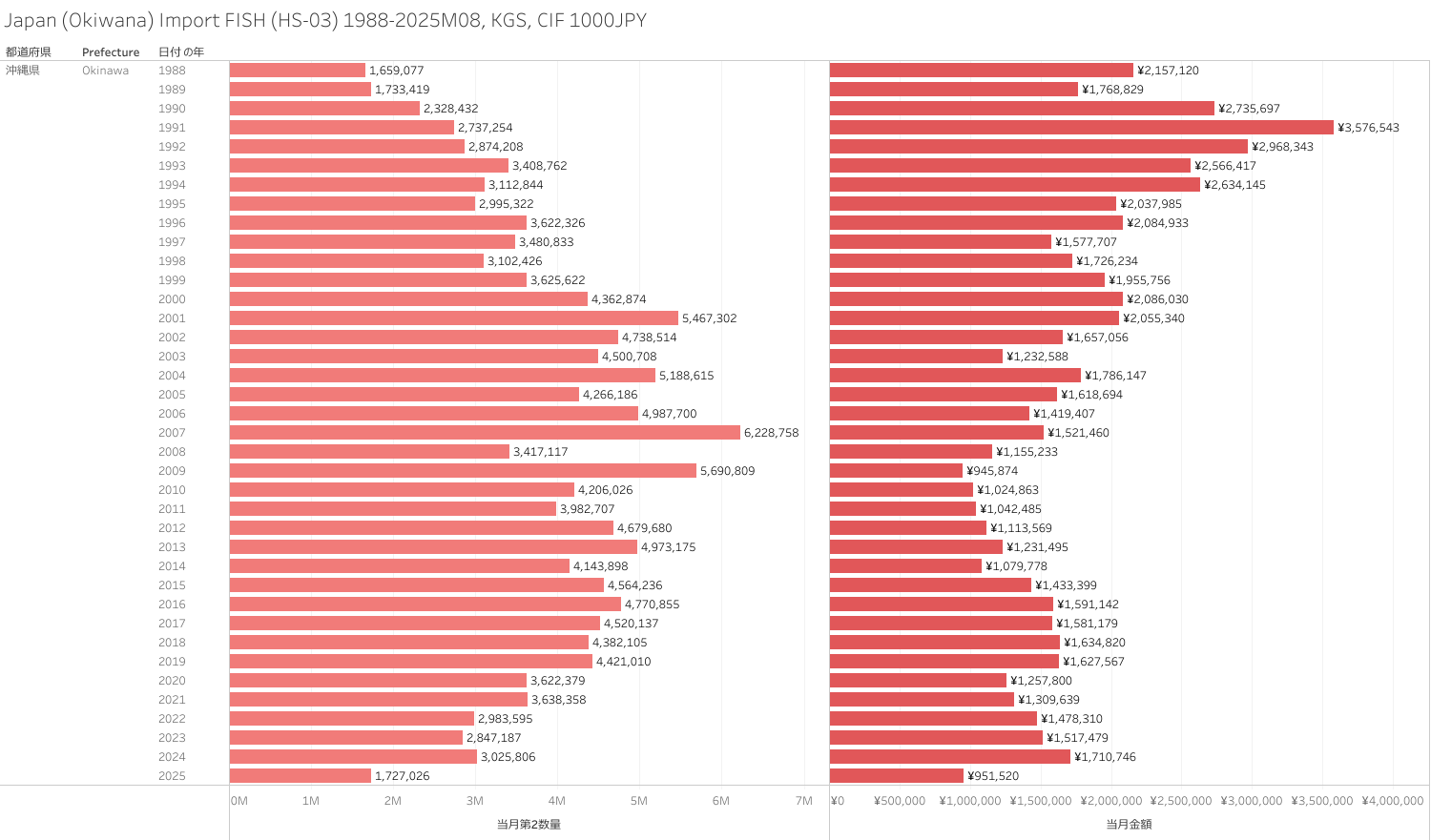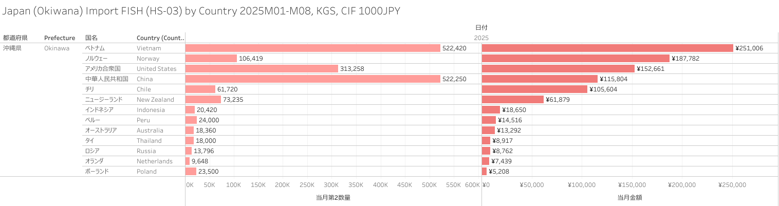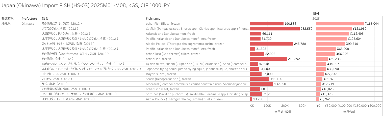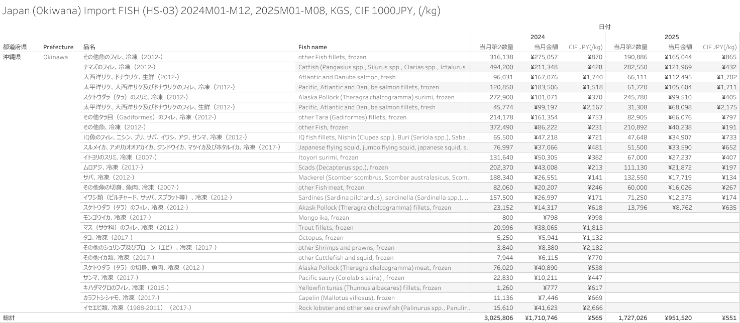 日本(沖縄県)水産物(HS-03)輸入統計 2025年8月まで