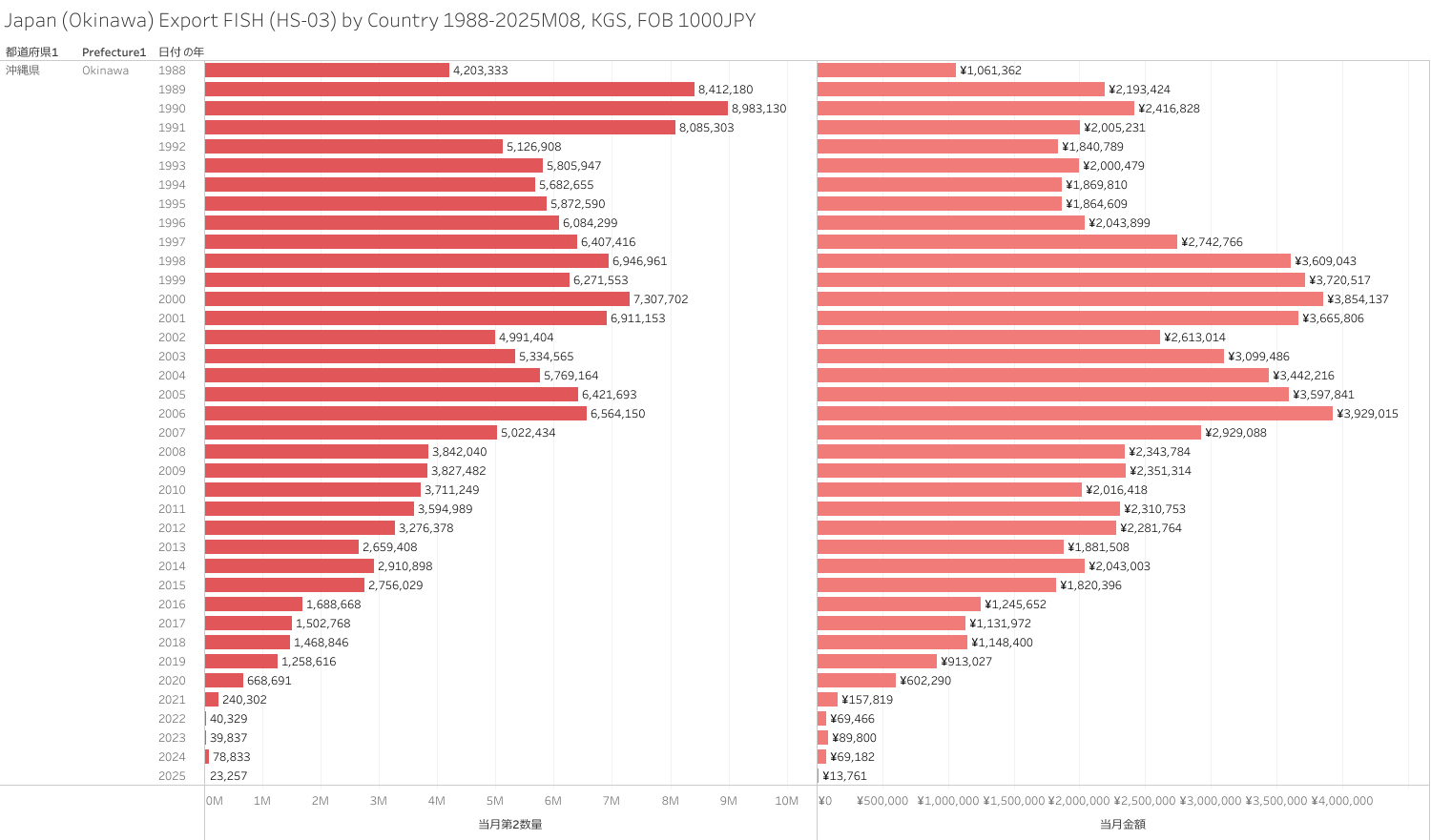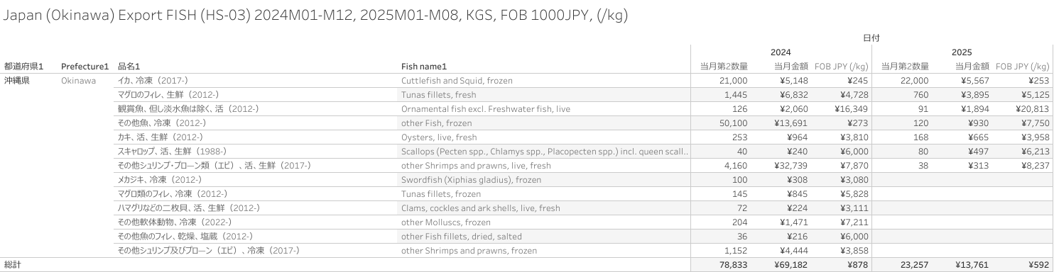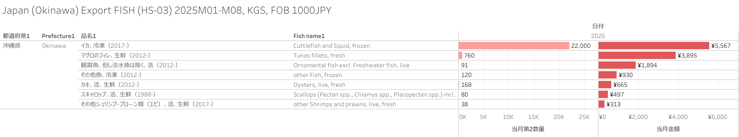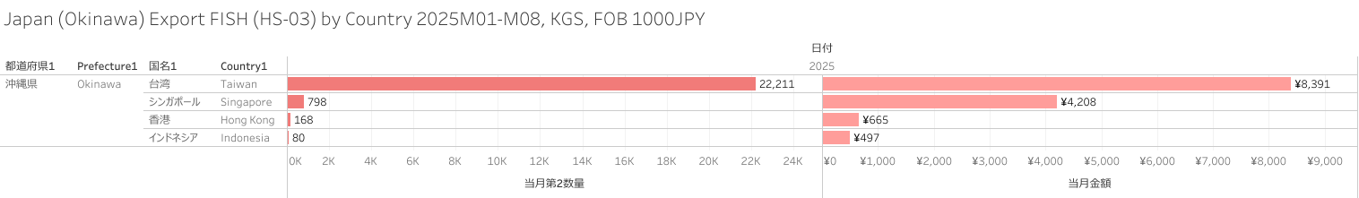 日本(沖縄県)水産物(HS-03)輸出統計 2025年8月まで