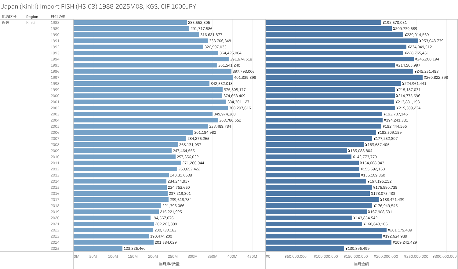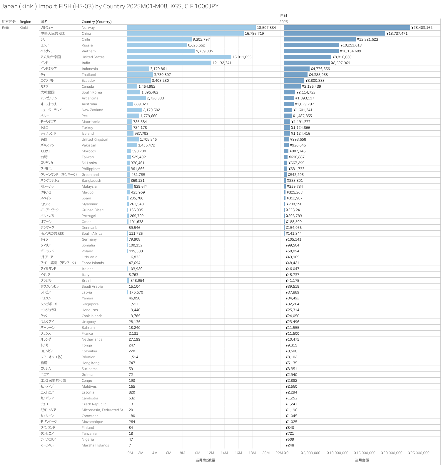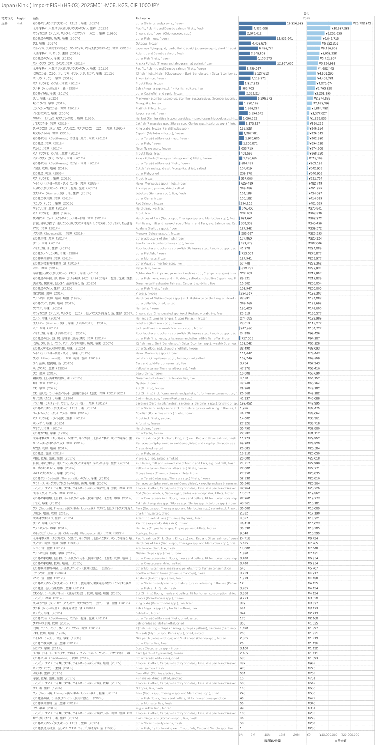 日本(近畿地方)水産物(HS-03)輸入統計 2025年8月まで