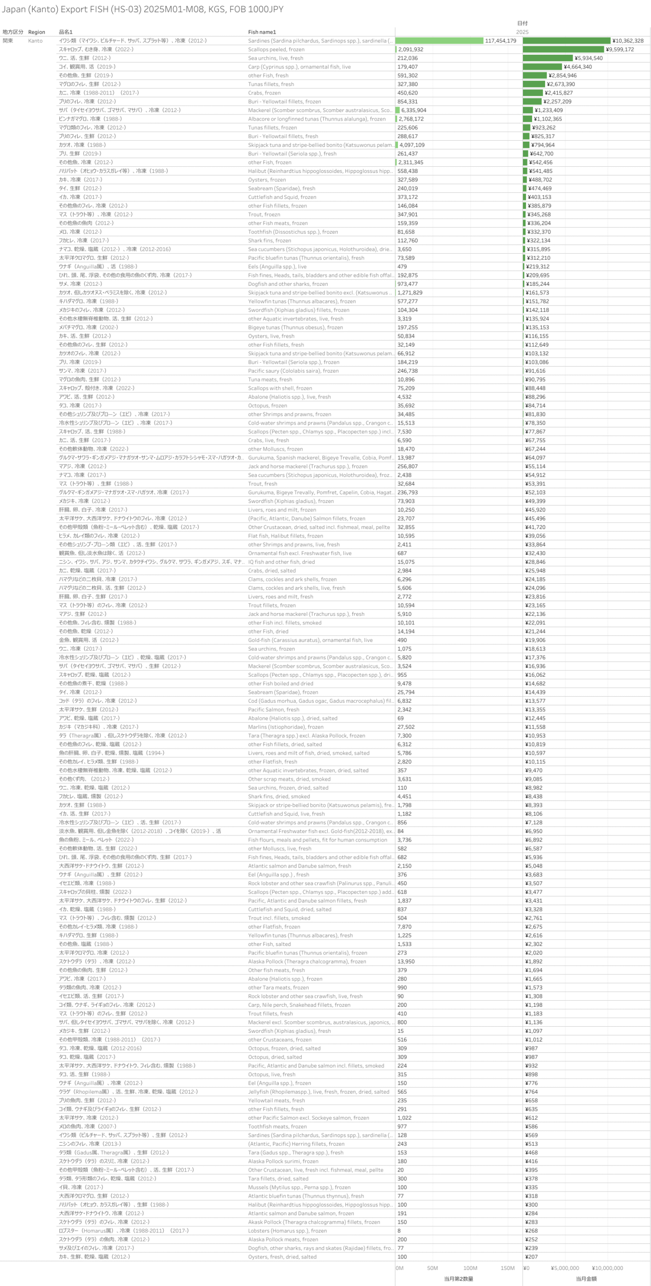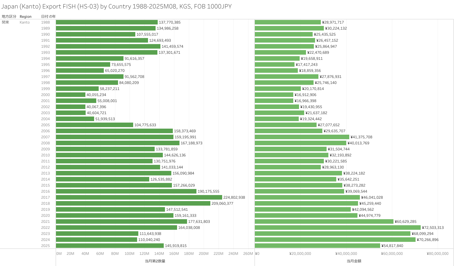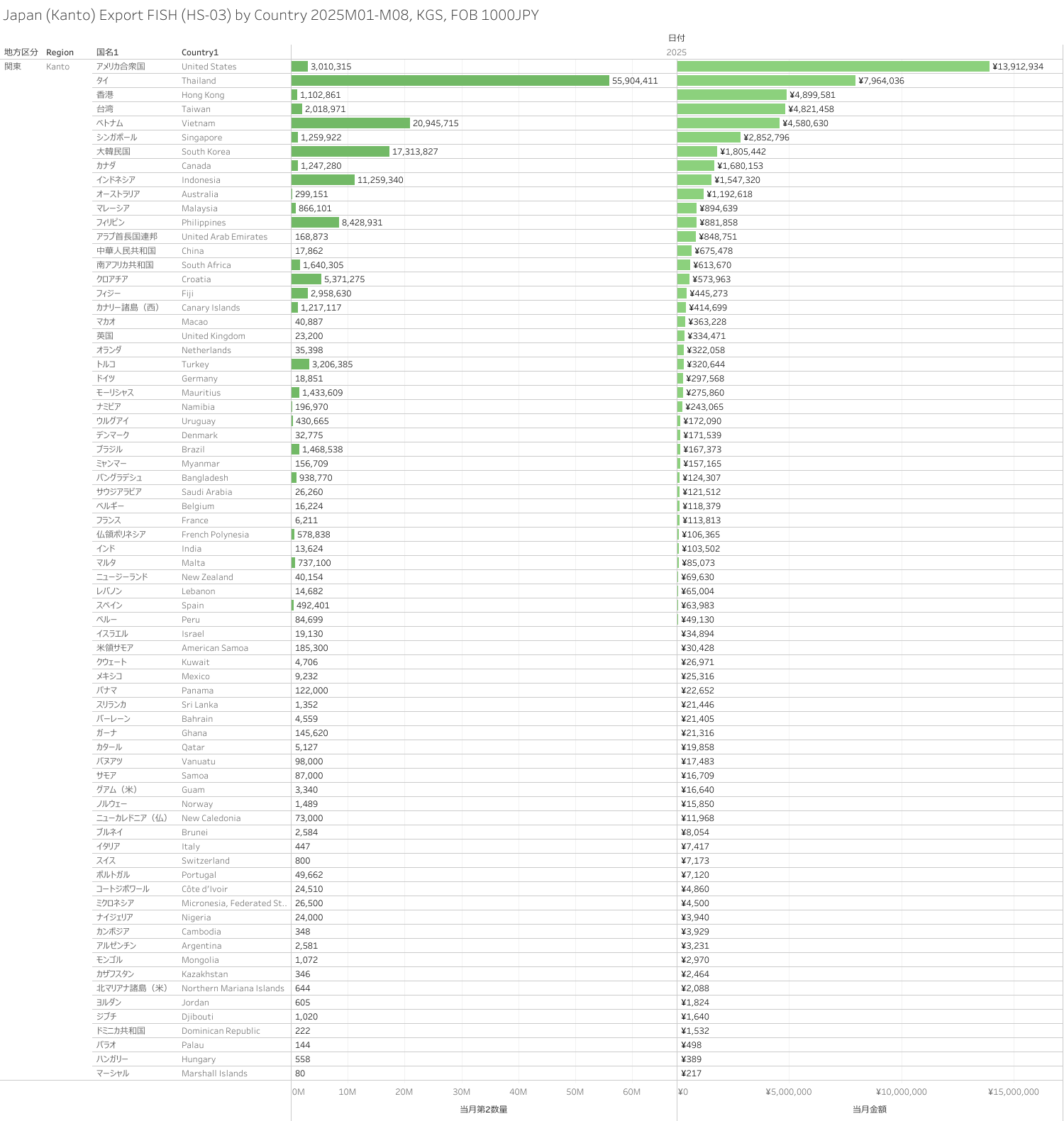 日本(関東地方)水産物(HS-03)輸出統計 2025年8月まで